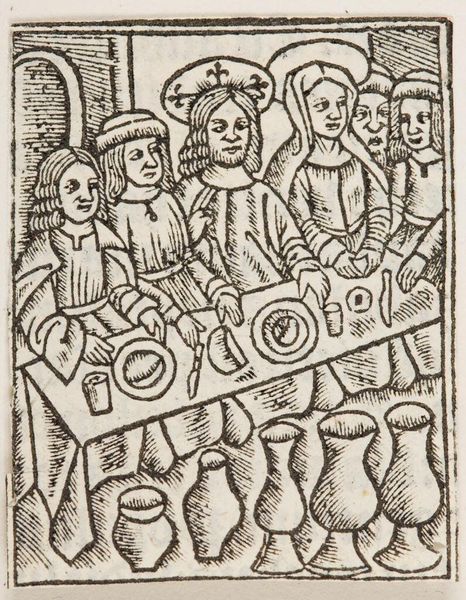 Editor: Here we have an anonymous woodcut, "Supper at Emmaus," housed at the Harvard Art Museums. It's a simple scene, but there's a stillness to it. What can you tell me about the cultural context of this image? Curator: This print speaks volumes about the role of religious imagery in shaping public understanding. The stark lines and accessible format made it easily reproducible, disseminating the biblical story of the Emmaus meal widely. How do you think that accessibility might have impacted its reception? Editor: It probably brought the story to people who couldn't read or attend church. Curator: Precisely. It democratized religious narratives, making them open to broader interpretation and personal reflection outside the confines of the Church. I’m left wondering about its original function and setting; what about you? Editor: I hadn't thought about its potential use as a teaching tool, but it makes perfect sense. Thanks!