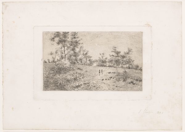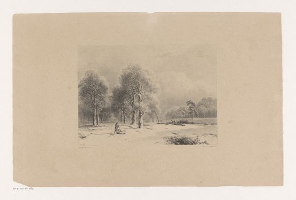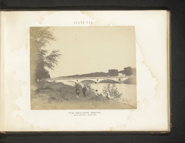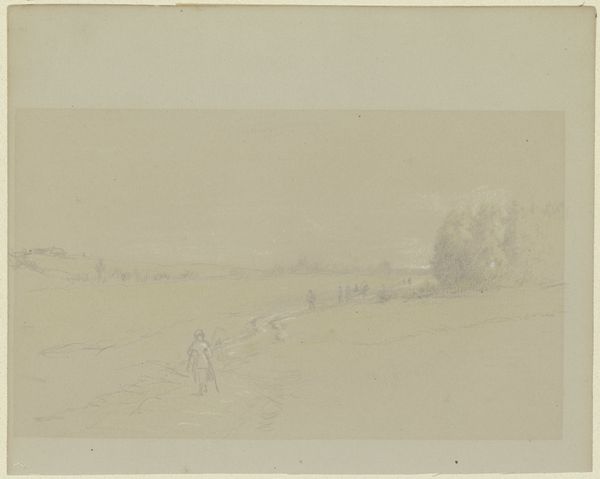 Curator: Let’s examine this photographic print, titled "Overstroming in Nieuwkuijk, Noord-Brabant," which translates to "Flooding in Nieuwkuijk, North Brabant." It’s attributed to Albert Greiner, and dates back to around 1880-1881. It now resides in the Rijksmuseum collection. Editor: It has an almost ghostly feel to it. The light palette and aged paper contribute to this somber mood. The texture of the paper really jumps out at me, it feels old and delicate. Curator: The choice of paper is fascinating, isn’t it? It looks like homemade paper; the materiality suggests something beyond a straightforward documentation of the event. Think about the labor involved in making paper like this and its inherent value in that period. Photography offered a new way of representation, yet it still carried associations with craft. Editor: Yes, absolutely. And looking at it from a historical point of view, the photo shows us not just the physical reality of the flooding, but it also raises questions about its impact on the community. We have several figures standing along the bank; were they involved with aid efforts or simply bystanders assessing damages? Were such scenes commonly photographed at that time? What would seeing this mean to the people depicted in this photograph? Curator: Exactly. Consider, too, the social context: this photograph likely wasn’t mass-produced in the way we understand photography today. Who was the intended audience? Was it meant to inform, to move people to action, or perhaps serve some other purpose related to the local structures of power at the time? What specific role did photography have within these disaster narratives, how it’s sold, viewed, and utilized within a specific context. Editor: It’s tempting to interpret it as a simple record, but it becomes so much more meaningful when we delve into the broader societal circumstances around both the event and how it was then depicted through visual media. It challenges us to consider not just what is seen, but *why* and *for whom* it was seen this way. Curator: It's been quite insightful to connect material properties to larger questions around labor and social purpose. Editor: Indeed. Thinking through those layers really enriched my appreciation. It’s more than just a photo; it's a visual echo of history and the materiality used, giving texture to social memory.