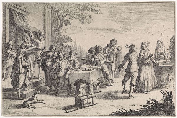 Editor: This engraving, "Maaltijd in Emmaüs," probably made sometime between 1630 and 1652, shows what looks like a biblical scene with some really interesting details, like a cat and dog in the corner! It seems to me, though, that there’s a definite sense of division here; some characters seem connected while others don’t. What catches your eye in terms of the deeper layers of meaning? Curator: That division you observed is interesting, especially when thinking about the cultural context in which this piece was created. These kinds of domestic scenes, although ostensibly religious, often also comment on contemporary social structures. Do you notice any signifiers of wealth or poverty, perhaps in the figures’ garments, or even in their relationship to the pets you mentioned? Editor: Now that you point that out, the fabrics definitely look fine. The presence of the cat and dog, so comfortable, does speak to the luxury of the setting. It's curious that in the background there's something ominous outside, visible from the window; is it some kind of war scene? Curator: Precisely! What does that juxtaposition suggest to you, having this interior scene of comfort contrasted with the implied turmoil outside? Consider the intended audience of such a print. Editor: Perhaps the artwork means to underscore the precariousness of their privileged lives at a time of constant religious conflict, or to encourage the people to contemplate their own fate. But I also realize it may be a reminder that privilege and suffering coexist, each shaping our perception of the other. Curator: Indeed! By encouraging these kinds of critical readings, we can see how these ostensibly religious scenes engage directly with questions of social justice and historical awareness that continue to be relevant today. Editor: I hadn't considered the work in that light before, seeing it more as just an illustration of a bible story. I'll definitely look at art from this period differently going forward.