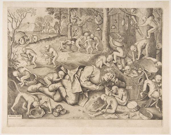 Adam van Noort created this drawing with pen and brown ink, accented by brown wash, on paper. At first glance, the composition appears to be a confluence of figural groupings interspersed within a detailed landscape, creating a complex interplay between foreground and background. Van Noort divides the pictorial space into distinct zones, from the amorous foreground figures to the active hunting scene in the midground, and the distant cityscape. The landscape isn’t merely a backdrop; it actively participates in the narrative. Note how the trees on the left act as a frame, guiding the viewer’s eye towards the figures. The use of line and wash gives the scene depth, yet there’s also a flattening effect. This tension between depth and surface is characteristic of Mannerist art, which often seeks to destabilize spatial conventions. Consider the use of brown ink. It unifies the composition but also creates a certain tonal ambiguity. Are we looking at a real landscape or an idealized one? Ultimately, this drawing invites us to consider the relationship between nature, culture, and representation.