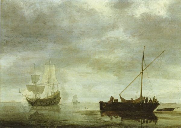 Simon de Vlieger painted "Visit of Frederick Hendriks II to Dordrecht in 1646", with what appear to be oils, depicting an array of ships at port. The scene is dominated by the interplay of light and shadow, with a muted palette evoking a palpable atmospheric depth. De Vlieger masterfully employs tonal variations to create a sense of space, using the water and sky to merge the horizon and imbue the scene with a misty quality. The composition is punctuated by the vertical masts of the ships, which rise against the horizontal expanse of the water, creating a dynamic tension. We can read the sails as signifiers of commerce and travel. The visual structure underscores a world in transition, as the trading ships represent the rise of merchant power in the Netherlands. By focusing on the formal qualities of the artwork, we reveal a complex interplay between artistic representation and cultural context. It’s a testament to how the structural components of art function as a vehicle for understanding deeper cultural narratives.