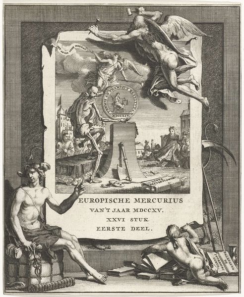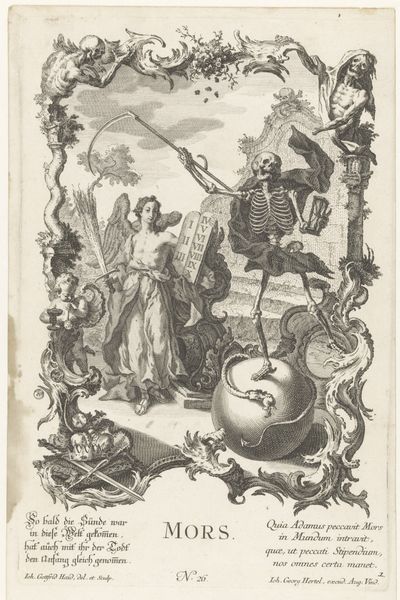 Editor: This is “Plate 33: Armorial trophy on a Tuscan column…”, an engraving by Johannes Meursius from 1636. It feels incredibly dense, almost overwhelming with all the figures and objects. What are we actually looking at here? Curator: We're looking at a carefully constructed monument of power. Note how the armor at the center isn't merely decorative, but a charged symbol. Armor historically signifies not just defense but chivalry, authority, and the noble virtues expected of Ferdinand. Does its presence here begin to suggest layers of deeper meanings, and the weight of expectation placed on Ferdinand? Editor: Definitely! It’s like a visual resume of his accomplishments and lineage, isn’t it? What about the allegorical figures and cherubs surrounding the column? Curator: Ah, yes, the supporting cast! Allegorical figures and cherubs weren't just decorative fluff. In this context, they evoke a sense of divine endorsement, illustrating how Ferdinand’s authority was seen as not only earthly but blessed by a higher power. These figures, like angels bestowing gifts, carry emotional and spiritual significance that reinforced Ferdinand's image. They contribute to the overall cultural memory, ensuring the endurance of Ferdinand's story. Do you see any echoes of this symbolic language in today's political imagery? Editor: That’s fascinating to consider. It’s a lot more calculated than I initially thought. Curator: It invites us to analyze the intentions behind this piece and question the narratives presented. Editor: I see the past in a totally new light, and understand how to look for the narrative woven into symbols! Thanks! Curator: Exactly! The resonance of historical symbols offers a profound and continuous dialogue with our understanding of power.