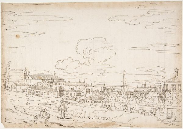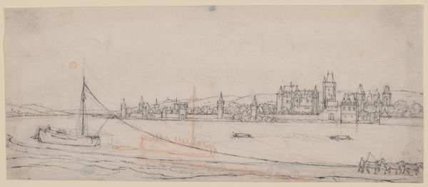 Curator: Let's delve into this intriguing ink drawing, "Stadt am Meer mit Befestigung," or "City by the Sea with Fortification," by Carl Friedrich von Rumohr, currently residing here at the Städel Museum. While the precise date of its creation remains unconfirmed, the stylistic elements firmly root it within the Romanticism movement. Editor: It’s kind of gloomy, isn’t it? All soft greys and sepia tones. Gives you the feeling of a dream fading at the edges. And the way he suggests form, hinting more than defining, I find quite striking. Curator: Absolutely, and this ambiguity invites us to consider the work through the lens of its socio-political context. Von Rumohr lived through a period of immense upheaval with the Napoleonic wars shaping the political landscape of Europe. Cityscapes, like this one, become interesting signifiers. Editor: Oh, I like that, yes. A dream-like recollection but also something strong, sturdy. Like remembering somewhere solid during difficult times. And that little boat on the water, makes me want to hop right in, even on such a somber day. Curator: The very subject itself, the city with its fortifications, underscores a period grappling with concepts of national identity and defense. Notice how the ink is layered. These architectural landmarks speak volumes about societal values embedded in spatial organization and historical preservation during the artist's time. Editor: Thinking about values, yes! And maybe even aspirations? A city perched near the sea…that makes me think of opportunity, newness. And it also seems so isolated. Makes me feel calm just looking at it. Curator: Calm yet resilient, perhaps? Reflecting the ethos of a society striving to secure its heritage while embracing change? Editor: Exactly. So much in one tiny, watery, dream. Curator: Indeed. This piece serves as a poignant reminder of the interconnectedness of art, history, and social consciousness. It beckons us to decode how art reflects and shapes our comprehension of collective identity during times of adversity. Editor: Makes you see more the longer you look, doesn’t it? Right, then. Let's go find something more upbeat... or not!
