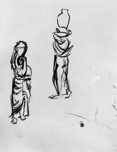 Editor: Jean-Louis Forain’s pencil drawing, "Hiding the ‘louis’,” likely created sometime between 1914 and 1919, presents two figures sketched with rapid lines. There’s a real sense of tension and maybe even some urgency in the scene. What strikes you most about this drawing? Curator: That sketchiness, you see? It’s raw, almost like catching a fleeting moment, a secret whispered in charcoal. This was wartime France, a country caught between hope and despair, painting and drawing as always, with the urgency to document their human spirit. Now, why do you think Forain focused on these two figures specifically, poised as they are? Editor: I wonder if it has something to do with the title, "Hiding the 'louis.'" Maybe they’re concealing something illegal or shameful? The slumped posture of the one figure makes me think so. Curator: Exactly! 'Louis' most likely references the 'Louis d’or,' a gold coin. During wartime, you had profiteering and anxieties everywhere. This wasn’t the grand spectacle of heroism you'd expect but intimate anxiety about survival, perhaps something shady. Have you ever felt that weight of responsibility and the secrecy it demands, especially when resources are scarce? It makes me think, even with so few lines, how well Forain manages to tell such a compelling story! Editor: I think I get it. It’s not just a simple drawing; it’s a glimpse into a very specific and anxious historical moment, where even a simple act of hiding money could carry so much weight and consequence. Thank you. Curator: The pleasure is all mine, young Padawan. Now, go forth, look deeper, and find the untold stories hiding in every line!