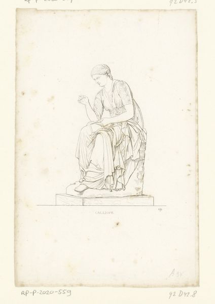 Curator: This is Nicolai Abildgaard’s pencil drawing, “En ung kvinde med en bikube fører en vinget ung mand hen mod en siddende kvindefigur,” created around 1792-93. Editor: My first thought is… delicate. There’s a tentative quality in the lines, like the image is emerging from the paper itself. And the bee hive is really quite curious, what could it signify? Curator: Well, the hive could easily stand as an emblem of industry and productivity within a societal context – it’s quite common during the Neoclassical movement where the public good was valued above all. I find this a quite compelling study in the visualization of civic virtue, mirroring the then-burgeoning focus on governance through reason and collective responsibility in revolutionary times. Editor: I’m particularly drawn to the medium itself, the humble pencil. It democratizes the image-making process, compared to, say, oil painting which required elaborate tools and apprenticeship, but it still demands a very keen observational awareness. How was such precision achieved in a study meant as only a precursor? It appears effortless and idealized in form, but it required so much more consideration in how the line would perform. Curator: I agree. The lines demonstrate a studied mastery, emulating antique models—look at the robes draped on the figures. I imagine that this piece speaks to the academic structures within which Abildgaard operated: instruction, copying of older art forms, the study of ancient culture for creating new forms. Editor: The presentation of labor also intrigues me. We see none of the tools, none of the actual mechanics, just the abstracted "young woman" bearing an abstracted hive of industry in her hands! The labour required for the final product seems so distant and immaterial to the composition of its subjects. Curator: True, labor, is idealized here – transmuted through a glass of classical virtue for civic duty and national order. But this idealization perhaps reflects the rising sentiments during a transformative, turbulent political and social epoch. Editor: This certainly makes you reflect about the artist's relationship with work and class structures, doesn’t it? So much thought put into line and form while completely avoiding representing the real-life toil of laborers. Curator: It’s a fantastic demonstration of how social currents influence art’s purpose, even when appearing distanced or idealistic. Editor: A beautiful artifact demonstrating the tensions and transitions embedded in art of its time.