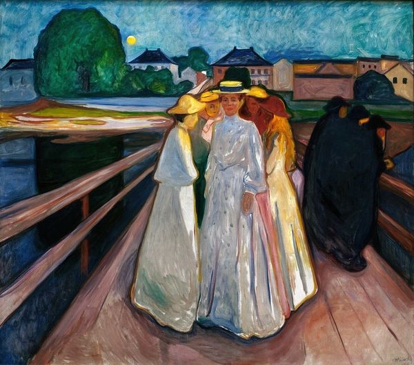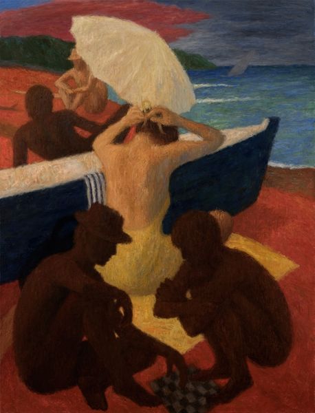 Curator: Welcome. Let’s explore a piece attributed to Theophrastos Triantafyllidis, an oil painting titled "Boating." Editor: Hmm, it’s lovely. My first impression is one of hazy serenity. There’s something very still and quiet about it. Like a memory, maybe a faded postcard. Curator: Precisely! I see this artwork through a lens of class and leisure. We observe a group, possibly a family, enjoying a leisurely boat ride. Notice the fashions and composition; there's a distinct performativity to their social roles within the broader context of bourgeois entertainment and societal expectations. Editor: Ah, performativity... yes, I see what you mean. It does feel staged in a way, but that just adds to the charm for me. The blurry city on the other side gives it a weird sense of unreality. Curator: Think, for example, about the role of women and parasols at that period in history, and how such paintings contributed in codifying beauty standards or leisure activities, for both genders and how it relates to ideas of patriarchy and social order. These representations also affect the viewer; by reinforcing notions of power, race, and gender. Editor: Okay, stepping away from theory for a moment. Something in the paint texture, maybe the brushwork in the water...makes me imagine the gentle rocking of the boat, the sunlight shimmering on the water. It is very sensory. And the red pops against the sea's hues, don’t you think? Curator: The use of impressionistic style here provides not only aesthetic qualities but functions also in solidifying the sense of leisure associated with the rising class that the artist attempts to depict. As such, “Boating” invites reflections on who has historically enjoyed representations in art, and how societal norms are conveyed through these scenes. Editor: Ultimately, I find "Boating" quite evocative despite what its initial purpose was or its message. Curator: Indeed, it highlights how art serves as a canvas for history. Editor: Leaving us much to contemplate even after we are gone boating on the ocean of thought.