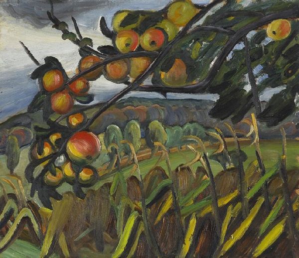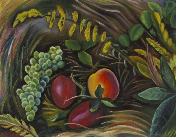 Curator: This painting, simply titled "September", was created in 1938 by Prudence Heward. It’s an oil painting. What’s your initial impression? Editor: It feels…claustrophobic, almost oppressive, despite the subject matter seemingly being from nature. The colors are rich, but muted, bordering on decay. What’s Heward trying to say? Curator: I see it as a meditation on temporality. Given the title "September," and Heward's broader context as a queer woman navigating the predominantly male art world of her time, the fruits could signify fleeting moments of sustenance and joy against a backdrop of societal constraints. Notice the brushwork and its potential link to production? Editor: Yes, there’s a tension there, a lack of finish. It isn't idealized—the impasto makes the surfaces look so coarse and physical. Were these plants available and common, do you think? This approach suggests the availability of resources but maybe a rough handling in making them art. Curator: That roughness you observe contributes to the painting’s emotional weight. Heward lived through a turbulent period—the Depression, rising fascism—and while not directly representational of these events, the painting may indirectly reflect those anxieties. I suggest also how "September," marks a transitional period. Summer's abundance is waning. Editor: Interesting. So it's less a celebration of autumn’s bounty and more a…premonition? Are the plums an aesthetic decision, or do they hint at something? Curator: Considering the prevalence of still lifes in art history and its historical association with female artists, this is more complex. While some fruits could represent prosperity and bounty, the almost bruised look of some pieces lends to a queer reading with the awareness that gender is political material. Editor: That’s thought-provoking. It's about transformation. We can think about how our experience is constantly shifting and influenced. It speaks volumes about how to deal with transformation as women and outsiders, don’t you think? Curator: I agree entirely. I came away seeing the interplay between visibility and obscurity in her compositions mirroring our complex individual position and resilience as queer individuals.