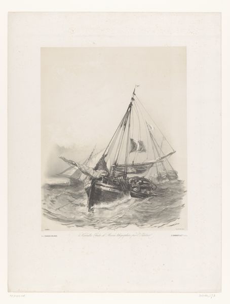 Editor: Here we have Eugène Lepoittevin's "Vissersboot op zee met zes opvarenden," or "Fishing boat at sea with six crew members," from 1832. It’s an engraving, and it strikes me as very…stark. Almost bleak, with the rough sea and the somewhat worn boat. What can you tell me about it? Curator: Well, let's consider the materiality of the print itself. An engraving, multiple impressions possible, meant for wider circulation than a painting. What does this accessibility tell us about the intended audience and the message the artist, and perhaps more importantly, the publisher, aimed to convey? Consider the social context: who was buying these prints, and what aspects of daily life—like the labour of fishermen depicted—were they consuming as art? Editor: So you're saying that the medium itself—the engraving—suggests it was meant to reach a wider audience and maybe even comment on the lives of the working class? Curator: Exactly. Furthermore, let’s not overlook the 'how' of the piece. Lepoittevin’s labor, the engraver’s skill translating the scene onto a plate… These details become paramount. How does the printmaking process itself shape our understanding of the scene depicted, and our relationship to it as consumers of art? Editor: That's a different way of looking at it, rather than just focusing on the image itself. I'm so used to analyzing the composition. Curator: And we shouldn't ignore the depicted materials. The wooden boat, the rough sea...These were directly linked to the lives of the fishermen. Romanticism often idealizes, but by representing it in a reproducible, consumable format, it raises questions about the romanticizing—or perhaps exploiting—of labour and lived experience for public consumption. Editor: That's really fascinating! I hadn't considered how the *process* and the materials used to create the art change its meaning. It goes beyond the aesthetic to the social. Curator: Precisely! By examining the means of production, the materiality, and the intended audience, we gain a far richer understanding.