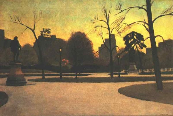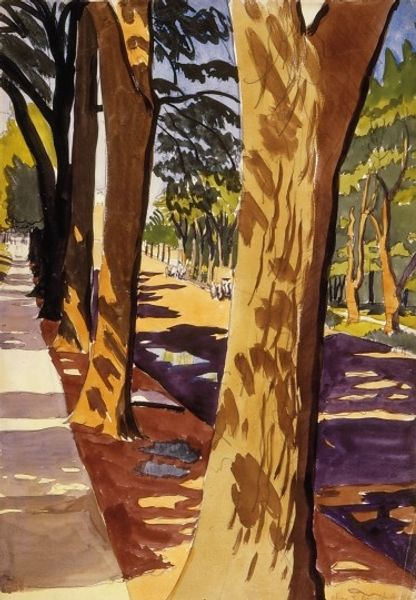 Editor: This is Henri Matisse's "The Path in the Bois de Boulogne," painted in 1903 using oil. It's remarkably dark for an Impressionist landscape; there's a sombre quality to it. What do you see in this piece, beyond the immediate impression? Curator: The darkness, as you call it, is precisely where the power lies. Bois de Boulogne, traditionally a site of leisure, here becomes a psychological space. Notice how the path, instead of inviting us in, almost seems to recede, to vanish into shadow. Consider the trees; they are not just trees, but gatekeepers, silent witnesses. Editor: Gatekeepers? That's intriguing. Can you elaborate on the symbolism? Curator: Certainly. Trees in art, across cultures, often represent life, growth, but also the connection between earth and sky, the seen and unseen. The dense canopy pressing down might symbolize the weight of societal expectations, perhaps even anxieties. Editor: So, Matisse is using a familiar scene to explore inner turmoil? Curator: Precisely! It’s about what isn't immediately visible. The subconscious filters of our own perception shape this experience. Does that limited color palette evoke specific emotions or memories for you? Editor: There’s a melancholy feeling, like autumn nearing its end and winter about to arrive. Curator: It makes you contemplate memory, time, the journey of life itself, doesn't it? It is through symbols that collective emotional truths can continue to live through the ages. Editor: It definitely shifts my perception of landscape painting. Thanks for sharing! Curator: My pleasure. Hopefully it underscores how symbolic readings offer a rich way to view our collective visual history.