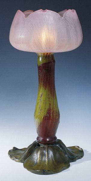 Editor: This is "Vase" by Louis C. Tiffany, crafted between 1893 and 1896. It’s glass, and currently residing at the Met. It has such a delicate, almost dreamlike quality about it. What symbolism or imagery do you see at play in this work? Curator: Ah, yes, a signature piece! To me, this vase isn't just a vessel; it's a chalice brimming with the symbolic language of Art Nouveau. Notice the abstracted floral motifs – they're not direct copies of nature but rather idealized forms. We see not just a flower, but the *idea* of a flower, embodying growth, beauty, and the cyclical nature of life. The elongated stem also emphasizes a yearning, doesn't it? Reaching toward the heavens. Editor: I hadn’t thought about the idea of reaching, but I can see it now. Curator: Indeed. Think about how glass itself functions as a metaphor here. It is fragile and precious and how light affects it; reflecting purity, truth and illumination. In an era of rapid industrialization, works like this vase also symbolized a yearning for handcrafted beauty. The artist consciously pulls away from replication to embrace something original. Editor: So, the medium and the motifs are all deliberately chosen to reflect this theme? Curator: Precisely. It invites the viewer to contemplate their own relationship with the natural world and its beauty and cycles. In some ways it mirrors psychological ideas that focus on how the conscious and unconscious become manifest, and what it reveals about cultural attitudes to beauty and death. What lasting impression does the vase make on you now? Editor: It is interesting to understand all the cultural information communicated by its form and surface. I can now appreciate how all aspects of the work coalesce into its singular effect! Curator: Absolutely, its enduring appeal resides not merely in its aesthetics but in the symbolic language it employs.