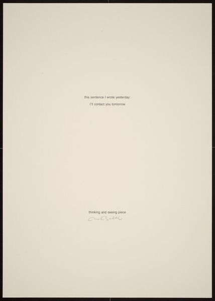 Editor: We’re looking at Robert Barry’s "Something That Needs Something Else To Survive," from 2011, a drawing on paper. It's mainly white space, with that text in the middle... It feels almost like a statement, stark and thought-provoking. What do you see in this piece? Curator: What I see is a deliberate act of reduction, playing on the traditional function of art institutions. Here's this large sheet of paper with a very simple statement, almost defiant in its minimalism. What do you think it needs to survive? The art? Or the idea? Editor: That’s interesting, I hadn't considered the 'idea' itself needing survival. Is the artist questioning the role of the viewer to complete the work's meaning, making it relevant? Curator: Precisely. Conceptual art often does that: challenges the established roles. We see this interest beginning in the late 1960s, exploding institutional expectations for what is and isn’t considered fine art. Consider Sol LeWitt's wall drawings which relied on others to realize them, democratizing art making in some respects while relying heavily on the institution to validate the project as art. The question shifts from the artwork itself to the *discourse* surrounding it. What do you think this simple work, in its dependence, is trying to teach us? Editor: Maybe that nothing exists in isolation? That art, or even just ideas, need context, need an audience to really live on? Curator: Exactly. And isn't that true of all things, culturally and historically? This piece prompts us to examine the framework – museums, discourse, and collective understanding – that allows any artwork, or any idea, to resonate. Editor: I didn't think such a simple drawing could raise so many questions about the art world itself! Curator: Minimal gestures can carry maximal weight, challenging established notions of originality and cultural authority. And for me, this is the mark of art that has a truly lasting effect.