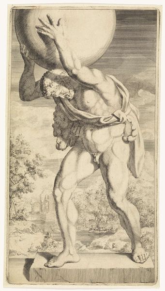 Lucas van Haelwech rendered this engraving of Marcus Valerius Corvus in the absence of a specific date. Van Haelwech’s classical subject matter and the graphic style place it within a northern European, humanist artistic context. The print is a paean to masculine ideals. Here, Corvus, a Roman hero, is pictured from behind, a perspective that emphasizes the body, making it available for the viewer’s appreciative gaze. The rear view also paradoxically withholds his identity, pushing the viewer to consider the symbols of power that define him. It is not his face, but his helmet, shield, cape, and sword that convey his status. The hero’s nudity also requires our attention. His bare buttocks are surprisingly vulnerable, even as his stance suggests preparedness for battle. The combination of masculine strength and partial vulnerability suggests a complex understanding of heroism. It’s not just about power, but also about the body’s inescapable exposure.