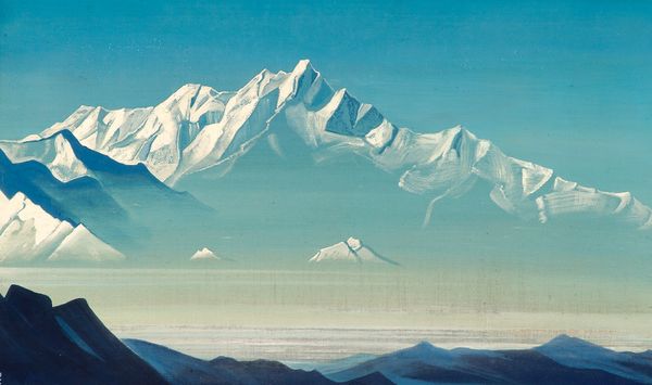 Editor: We’re looking at "On the Heights (Tummo)," a tempera painting by Nicholas Roerich from 1936. It’s dominated by cool blues and shows a figure in meditation against a backdrop of formidable mountains. I’m immediately struck by the geometric quality of the peaks, and the sense of stillness. How do you read this composition? Curator: Formally, observe how Roerich uses a restricted palette to emphasize the painting's structure. Notice how the repetition of triangular forms, in both the mountains and the figure's posture, creates a rhythmic visual echo. The placement of the figure at the apex provides a focal point, concentrating the viewer's gaze. Do you see how the color saturation directs our sightlines? Editor: Yes, the intense blue of the sky really contrasts with the pale mountains, almost flattening the space. It pushes the figure forward, too. Curator: Precisely. The composition sacrifices depth for symbolic resonance. What appears to be a landscape transcends simple representation. Consider the artist’s choices – the reduction of form to essential shapes, the limited color range… These emphasize a spiritual rather than literal interpretation. How might the materiality of tempera contribute to this effect? Editor: Because it's matte, there's a lack of sheen which feels appropriate for the subject of spiritual elevation. Curator: Exactly. The painting denies illusionism in favor of iconic presence. This work compels the viewer to contemplate the relationship between the physical and the transcendental, rendered through simplified form. Editor: It's amazing how a painting so seemingly straightforward in its representation can hold so many layers of meaning simply through its formal elements. Curator: Indeed. A reminder that visual language is not just about what is depicted, but how.