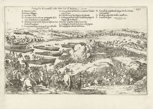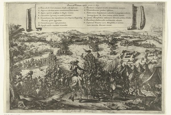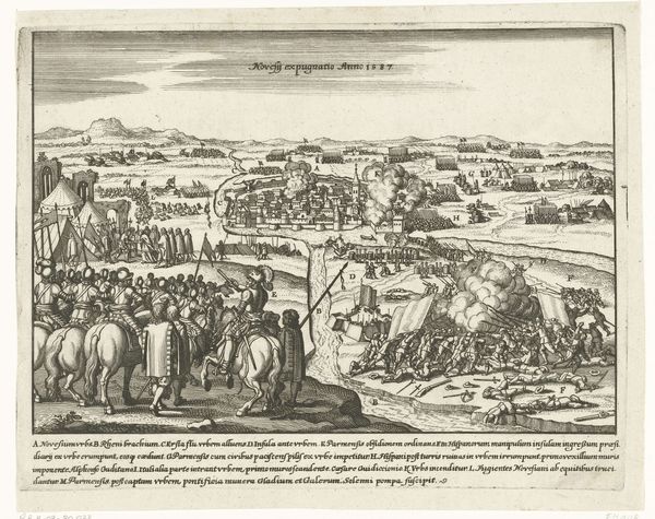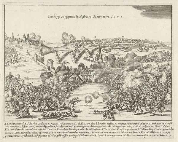 Editor: Here we have a print titled "Verovering van de stad Limburg, 1578," which translates to "Conquest of the City of Limburg, 1578." It's an engraving dating sometime between 1630 and 1699. Looking at the dense composition, all those tiny figures engaged in battle… what can you tell me about its context? Curator: Well, let's consider this depiction of the Siege of Limburg through a critical lens. It’s not simply a neutral historical record. How might this print function as propaganda, shaping public perception of the conflict between the Spanish and the Dutch? What does it tell us about power structures and representation? Editor: Propaganda, interesting! I hadn't really thought of it that way. I was more focused on the purely historical. So, how can we see the political agenda reflected in the artistic choices made in this piece? Curator: Notice the overwhelming presence of the Spanish troops. How might this depiction of force and order have reinforced ideas about their power? And conversely, consider how the Limburgers are portrayed - does their resistance get as much attention? Are they romanticized or vilified, and what social narrative does this promote? Editor: They do seem to be on the run. The print certainly leans toward a glorified representation of Spanish military might. Perhaps that's why they included all that text with a key to explain the city and forces, too? Curator: Exactly! The labels aren't just descriptive. They guide our interpretation. Ask yourself, who commissioned this work, and what purpose did it serve within the broader context of the Eighty Years’ War? What about its potential role in constructing national identity during that tumultuous time? Editor: That really shifts my understanding. I was seeing a straightforward depiction of a historical event, but now I see the complex layers of political messaging and power dynamics at play. Curator: Precisely. Art isn't created in a vacuum; understanding its historical and social context is key. It encourages a critical dialogue, situating art within broader intersectional narratives. Editor: I see that so much more clearly now. Thanks!