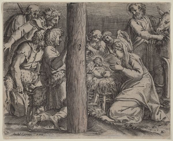 Curator: Here we have Girolamo da Carpi’s oil on panel, "The Adoration of the Shepherds", dating from about 1535 to 1540. What's your immediate take on this one? Editor: It’s… theatrical, almost stage-lit. The drama is cranked up with that single light source breaking through the darkness. I notice also a tension between idealized figures and rather… earthly surroundings. Curator: Precisely. It is a potent piece of Italian Renaissance painting. The shepherd's adoration here isn’t just about reverence; it’s also very much about humanity's raw connection to the divine. Notice the use of impasto; that tangible materiality… Editor: That materiality underscores everything! Look at those shepherds practically falling over themselves, straining, and leaning, and I keep wondering about Carpi's choice of materials – the cost of pigments, where the panel came from, and what kind of workshop he was running. Those things shape our encounters, too. It makes one wonder: what did those raw materials cost in terms of labour? Curator: Absolutely. We're grounded in the practical realities of creation. Still, observe how the landscape plays almost a character too, sheltering this momentous event. It seems at once very present yet timeless, almost dreaming its way to this specific moment. And consider the figures' gestures... Editor: Gestures that highlight the social relationships depicted within the narrative and across social groups—between those who made the oil, the shepherd's skin tone in contrast with other, nobler materials. And I like that you pointed out the landscape, because you can appreciate the labor involved not only in grinding stones for the oil paints, but hauling rocks as well... Curator: Yes, these visual components all culminate into something transcendent while staying undeniably human and made, as you say. Thank you! Editor: And thank you for the fresh insights as to the historical perspective, it allowed us to understand it more deeply!