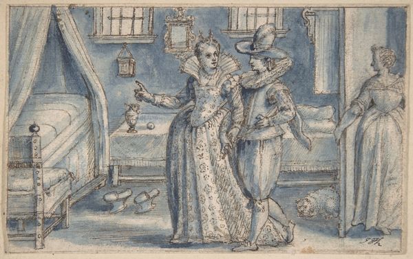 Editor: Right, let's talk about this disturbing scene, Salome with the Head of John the Baptist. It's attributed to Lucas van Leyden, done sometime between 1550 and 1600, ink and pen on paper. I am quite intrigued, what jumps out at you? Curator: What an incredible moment captured with such delicate detail, no? The longer I look, the more the scene unfolds. Salome is central, her gaze...somewhere else entirely, while she receives John’s head. Have you ever felt that strange disconnect, that sort of...polite disinterest while something truly monumental happens around you? Editor: I... I hadn't considered the *disinterest* aspect. I was caught up on the gruesomeness of it all, to be honest. Curator: Of course! The horror is certainly there – but for me, the genius lies in contrasting it with everyday moments. Observe the dog at her feet. Dogs are such keen observers, so sensitive to atmosphere. How often do we get wrapped up in the mundane while standing on history’s threshold? What do *you* think the artist is saying here? Editor: That's so insightful. Maybe... maybe that even in moments of extreme violence or historical significance, life goes on, or appears to. Curator: Exactly! Like history and humdrum waltzing together, eternally intertwined. Now, observe the checkerboard floor. Its precision brings a strong perspective to this world... do you think there’s an intent to the contrast it to the moral complexities on display? Editor: Good point. Maybe the floor signifies a clear, almost black-and-white view of the world, whereas the story of Salome is full of gray areas and manipulation? Curator: Precisely. Lucas invites us to navigate those shades, not to condemn but to *witness*. He reminds us that the grand stage of history is built upon choices made by flawed humans, much like ourselves. I wonder…are we watching history in the making right now? Editor: Whoa, heavy stuff! I’ll never see this piece the same way again.