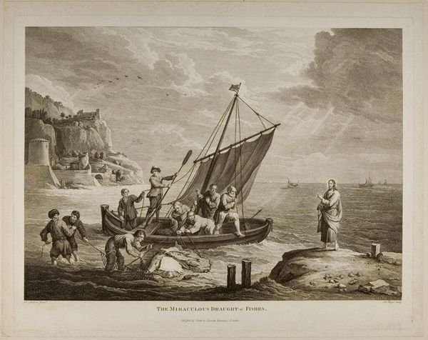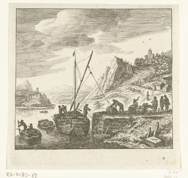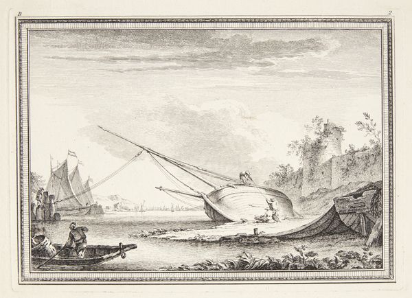 Curator: This engraving, attributed to Simon Fokke and dating somewhere between 1722 and 1782, is called "Jongeman in een zeilboot," or "Young Man in a Sailboat." It resides here at the Rijksmuseum. Editor: It’s immediately striking; chaotic yet strangely calm at the same time. Look at that finely wrought texture! The waves especially feel so raw and real, achieved purely through line work. Curator: Indeed. This image likely served as an illustration within a larger publication. Fokke was quite active in Amsterdam's print culture. Considering that prints facilitated the dissemination of information and ideas to a broad audience, we should consider how this imagery, particularly during the Enlightenment, contributed to shaping public opinion and societal norms. Editor: The engraving process itself tells a story of meticulous labor. You see the distinct marks and controlled cuts made with the engraver's tool—evidence of the printmaker's hand, crucial to its replication and accessibility. It would be interesting to compare the types of papers used for printing it, and where the papers themselves were manufactured. Curator: The details do prompt many avenues for interpretation. A closer look reveals not just the young man but other figures and vessels amidst naval warfare. Perhaps this is a genre painting, intended as entertainment but also reflecting the prevalent maritime power of the Dutch Republic? It would also be important to place this image alongside similar prints from that period. Editor: Absolutely. It’s hard to ignore how material considerations intertwine with social narrative. The relatively affordable cost of prints at this scale democratized access to art. How often did such prints then end up circulating around studios? What other practical purposes did it serve beyond pure aesthetics? Curator: A productive reflection that shifts the discourse toward its agency within eighteenth-century culture! By exploring its accessibility and usage, we unveil some hidden aspects of the artistic creation. Editor: Exactly. Hopefully, we can uncover what other latent qualities await discovery when viewed through the lens of its very fabrication.
