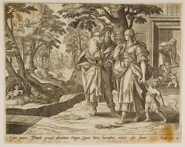 Curator: This finely wrought engraving by Adriaen Collaert, made after Marten de Vos, depicts "Abraham and Lot Departing for Canaan." It’s currently held at the Harvard Art Museums. Editor: It strikes me as a somewhat romanticized vision of migration, everyone adorned in detailed, almost theatrical costumes, with livestock in tow. I wonder how this imagery served the social and political contexts of its time. Curator: Absolutely, the rendering of fabric and the attention to detail are incredible. We can consider the conditions of production, and the availability of materials for both artist and subject. Who was this made for, what was its intended circulation? Editor: And how did those viewing it then interpret the narratives of displacement, promise, and perhaps even colonial ambition embedded within this biblical scene? It presents a very particular visual language. Curator: Indeed, analyzing the paper, the ink, the printing process allows us to consider its place within a larger economic and artistic ecosystem. Editor: It's fascinating to consider how this piece invites us to engage with both a historical narrative and its enduring relevance to contemporary discussions around migration and identity. Curator: Exactly. A work this nuanced requires looking at the tangible means of its creation and the ideologies it may reinforce or challenge. Editor: Agreed, each viewing offers a chance to re-evaluate our understanding.
