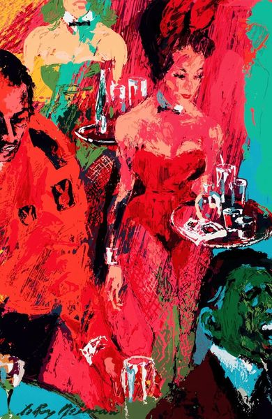 Curator: Looking at Neiman’s “Tossed Salad,” created in 1965 with acrylic paint, what catches your eye? It's quite a lively scene. Editor: It certainly is! It feels very "Mad Men," doesn’t it? The figures are almost caricatures. What social dynamics might Neiman be commenting on through the lens of this bustling scene? Curator: Precisely! It's not just about representation, but presentation of mid-century social rituals. Consider the materials: acrylics. Why acrylic instead of oils, which had been favored for centuries? Neiman leverages the speed and vibrancy of acrylic paint—a newly industrialized material at the time. What does that tell us about the burgeoning speed and new aesthetic tastes during this period? Editor: So the very material reflects the changing pace of life! I see how the boldness and quick-drying nature of acrylics might capture the energy he’s after. The subjects are upper class folks—what kind of lifestyle is implied, here, and is Neiman endorsing it, criticizing it, or simply mirroring it? Curator: That's the key question. Are we to see this as a glamorous portrayal of a high-society luncheon or a critique of bourgeois consumption? Notice how Neiman uses broad strokes and heightened color; the figures aren’t naturalistic but stylized, manufactured through paint and the painter's hand. How does this mode of representation relate to production of wealth or status in the scene depicted? Editor: So, by focusing on how the artwork was physically made, with particular attention to the social and material history of its supplies, we find avenues to address larger ideas in culture, then! Curator: Exactly. Art-making never exists in a vacuum. Examining the choices of production--from materials to style--helps us consider who is catered to in these bustling, chaotic scenes. Editor: It's so interesting to see how deeply ingrained history is, right there in the textures and colors of "Tossed Salad." Thank you for shedding light on that!