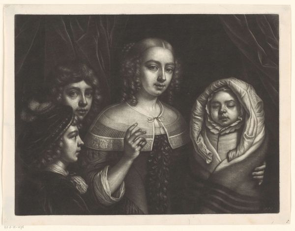 Curator: Good morning. We are standing before Wallerant Vaillant's "Portret van een moeder met vier kinderen", or "Portrait of a Mother with Four Children", created sometime between 1658 and 1677. This Baroque engraving offers a fascinating glimpse into family life. Editor: It's remarkably intimate. The soft lines of the engraving lend the scene a very delicate, almost ethereal quality. The subjects almost seem to emerge from the darkness. Curator: Vaillant's technical skill in creating tonal variations is noteworthy. He utilizes a single medium to evoke a sense of light and shadow, effectively sculpting the figures within the frame. Observe how the drapery cascades. Editor: The portrayal of motherhood as a civic and moral cornerstone was a common theme in 17th century Dutch society, a period marked by significant shifts in social structure and the rise of the bourgeoisie. The text below the artwork actually labels this “Charitas” which aligns to the depiction of maternal “Charity.” Curator: Indeed. "Charitas", often visually linked to motherhood, elevates this family portrait. But let’s consider the composition itself; the pyramid shape, anchored by the mother's gaze and cascading dress, creates a focal point that leads our eye through each child, inviting close scrutiny. Editor: Considering that this piece hangs here at the Rijksmuseum in Amsterdam, wouldn't it be fruitful to examine how similar representations of domestic life were showcased in domestic settings? Who commissioned the portrait and how were images such as this viewed among the sitter's social circle? Curator: A worthy inquiry, to be sure. I would be fascinated to know, too, how Vaillant distributed tonal values here, particularly using an almost uniformly monochrome pallet to direct focus. It truly reinforces the sentiment and subject. Editor: Ultimately, I think this piece provides us with another snapshot of motherhood at this specific time period through art, and as we look at images such as this in conversation with other mediums like fashion, domestic décor, or trade markets, then the story becomes more complete and more informative to museum visitors. Curator: Agreed. Thank you for shedding light on how social narratives complement formal artistry. I hope listeners enjoy viewing "Portret van een moeder met vier kinderen" here at the Rijksmuseum.