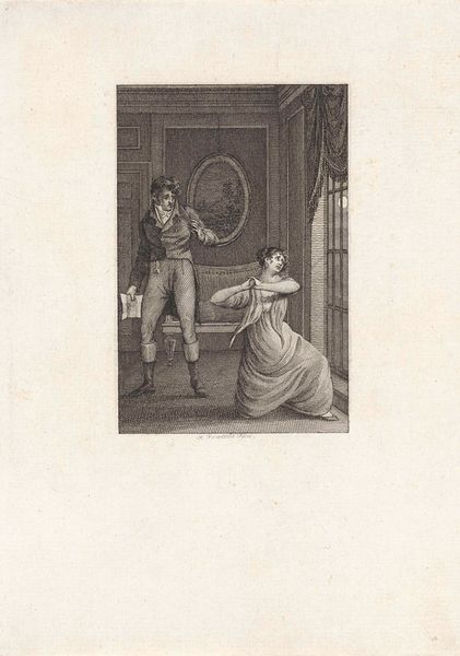 Laurent Guyot made this print, titled *Couple amoureux à la promenade*, in 1798. As part of a series of fashion plates, it captures the sartorial tastes during the French Directory, a period of radical change following the French Revolution. The print depicts a couple on a stroll, embodying the era's evolving ideals of beauty and social roles. Her high-waisted dress, inspired by classical antiquity, symbolizes a break from the aristocratic excesses of the Ancien Régime. His tailored coat and cravat suggest a more restrained masculine elegance. The intimate composition hints at shifting gender dynamics, with the couple appearing as equals in their leisurely pursuit. Yet, the print also speaks to enduring class distinctions, showcasing the refined attire of the bourgeoisie amidst a society still grappling with inequality. Guyot's fashion plates offer a glimpse into a world in transition. They reflect a yearning for a new social order while revealing the complexities of identity in a revolutionary age.