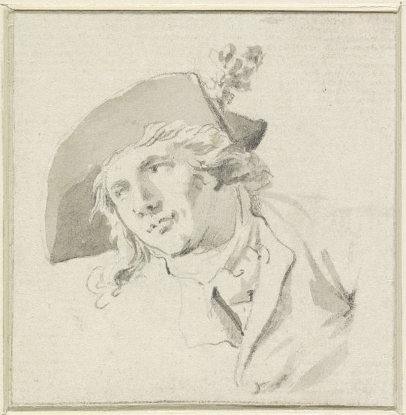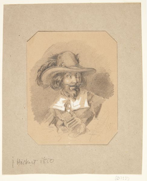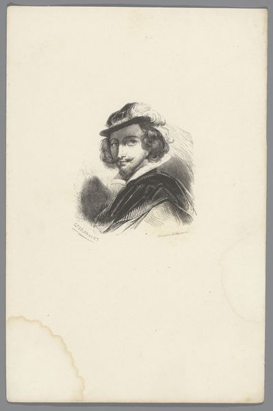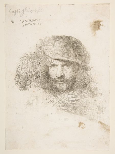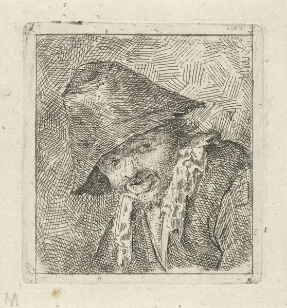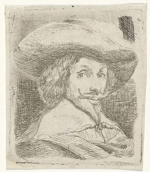 Curator: This etching is identified as "Portræt af en mand med hat, formentlig maleren Pieter van Laer," or, Portrait of a Man with a Hat, Presumably the Painter Pieter van Laer, attributed to Jan van Ossenbeeck. The piece dates sometime between 1624 and 1674. Editor: The figure seems to emerge from the page. The linework is so delicate yet creates a vivid, somewhat melancholic, presence. It feels incredibly intimate, like a fleeting glance. Curator: Indeed. The portrait as a form had been developing an increasing interiority at this point, and an etching like this could easily circulate amongst an artistic community. Editor: I’m immediately drawn to the hat, though. It is so large and floppy and seems to overshadow the face. Considering the sitter's potential identity, could the hat symbolize something about the artistic identity? Perhaps an aspiration to emulate a Bohemian lifestyle? Curator: The hat certainly sets the tone! By this time, the "bohemian" artist was very much a type, living outside the constraints of established society. Van Laer, if it is him, would have participated in the Bentvueghels, a society of mostly Dutch and Flemish artists known for their unconventional lifestyles in Rome. Editor: Ah, that context makes it even richer. The sketchiness of the line, then, reinforces the carefree and possibly somewhat unfinished nature of that artistic life, always a work in progress, never static. Do you think this etching was made as a form of self-promotion for Ossenbeeck? Curator: It could have functioned as a calling card or a study. Prints were relatively affordable and widely distributed, offering a crucial means of disseminating images and ideas at this time. So perhaps the artist advertised themselves. Editor: Considering its apparent simplicity, there's so much to unpack about the self-image of artists and the communities they cultivated during the Baroque period. Curator: Precisely. An image like this demonstrates how artistic identity became a performative act as much as an inherent attribute. Editor: Looking closely, it offers a potent distillation of an artist's self-awareness within a changing cultural landscape. Curator: It leaves me considering how we construct identity, especially in artistic spheres, even today.