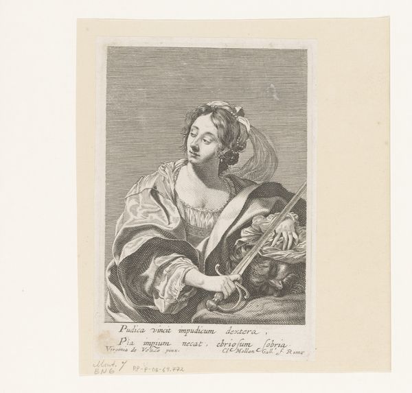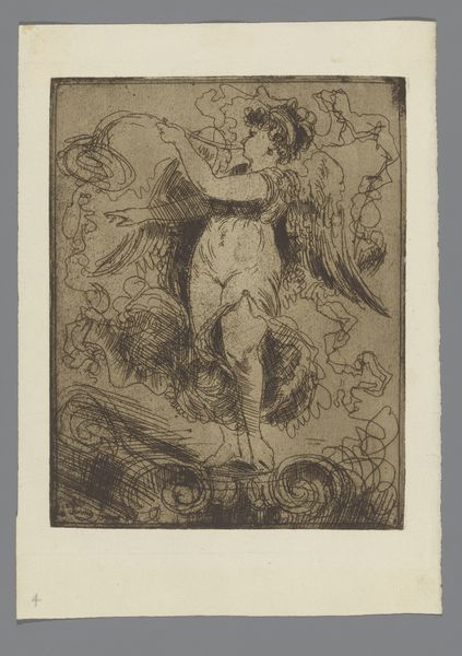 Salvatore Tresca created this print of "Frimaire," sometime between 1750 and 1815. In muted tones, Tresca presents a scene of classical allegory with a figure who embodies the month of Frimaire in the Republican Calendar. The subject is portrayed with a formal elegance, her figure rendered with a balance of curved and straight lines. The composition is structured around her central pose, drawing the eye from the curve of her bow to the dog at her side, and upwards to the sky where a chariot and figures emerge in the sky. She is adorned with the symbols of the hunt and winter, all meticulously detailed in the engraving. Tresca employs a nuanced approach to depth and texture, creating a semiotic interplay where classical form meets revolutionary ideals. The classical composition reflects a desire to stabilize revolutionary shifts within the established aesthetic values of the time. The print, therefore, functions as a site where the old order is renegotiated through new forms of representation.