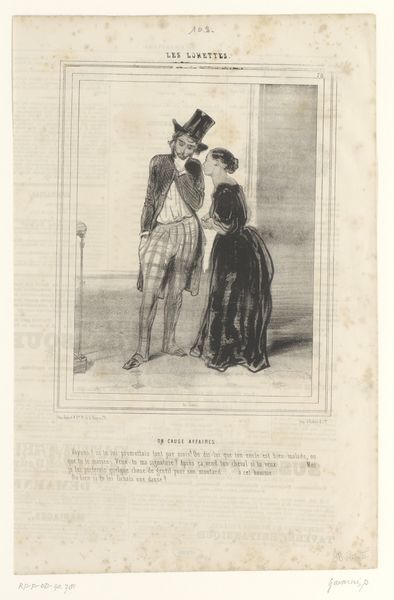 This print, "Vrouw gelooft niet dat haar man de waarheid spreekt" (Woman does not believe her husband is telling the truth), was created by Paul Gavarni, a 19th-century French artist known for his satirical depictions of Parisian life. In this image, we see a snapshot of domestic tension, a common theme in Gavarni's work. A man lounges on a sofa, while a woman stands beside him, her posture suggesting confrontation. The artwork is part of a series called "Impressions de Ménage," which translates to "Household Impressions". This points to the societal expectations and gender roles of the time, where men were often portrayed as dominant and women were expected to manage the household. Gavarni captures a universal experience: the complexities of relationships and the subtle power dynamics within them. The woman’s disbelief is palpable, her body language challenging the man’s perceived authority. Through this intimate scene, Gavarni invites us to reflect on the hidden struggles and negotiations that shape our personal lives.