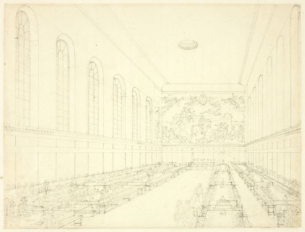 Editor: Here we have Augustus Charles Pugin's "Study for Surrey Institution, from Microcosm of London," dating from around 1809. It's a graphite and etching piece, quite detailed for its size. It strikes me how the artist meticulously rendered the interior architecture. What stands out to you when you look at this? Curator: It’s a fascinating glimpse into the labor of representation, isn’t it? Consider the graphite— a readily available material, almost industrial in its commonality—used here to depict the aspirations of Neoclassical London. How does the process of etching, this repeatable method, democratize or perhaps commodify the architectural ambition? Editor: That's interesting – framing it as a sort of architectural commodity. I hadn’t thought of it that way. So the choice of etching enables mass production and broader access to the image of this institution? Curator: Exactly. And beyond mere reproduction, let's consider the social context. The Surrey Institution aimed to provide education and promote the arts and sciences. Who had access to this institution, both physically and through images like this? Were the laboring classes invited to learn, or merely to observe from a distance? Editor: So you’re saying the print becomes a kind of…advertisement? Promoting inclusion, perhaps falsely, depending on who it really served? Curator: Precisely. The materials themselves—the graphite, the etching process, the paper—and their dissemination become tools for reinforcing societal hierarchies, despite the Institution's stated goals. The piece invites us to question whose narrative is truly being represented, and at what cost. Editor: That connection of material to the building's purpose is eye-opening! I’ll never see an etching the same way again. Curator: Art like this reminds us to always examine the materials, the making, and the market forces shaping what we see, and who benefits from it all.