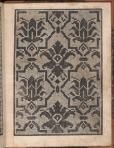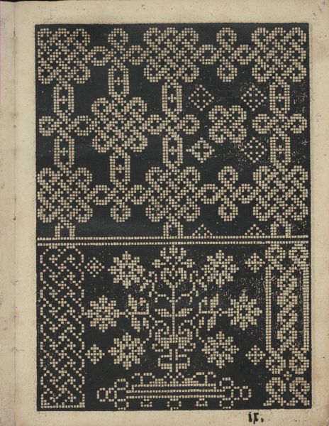 Curator: The contrasting geometries create an interesting tension. The entire page has this striking woodcut effect. Editor: We’re looking at a page, specifically page 11 recto, from "Libbretto nouellamete composto per maestro Domenico da Sera…lauorare di ogni sorte di punti", dating to 1532. It's attributed to Domenico da Sera and can be found at the Metropolitan Museum of Art. Curator: Ah, so this wasn't conceived as a piece of fine art but something more functional? It seems more about pattern and precision, rather than personal expression. It looks like something you’d use as a guide or blueprint. Editor: Precisely. The "Libbretto" served as a pattern book. This print is actually a woodcut on paper, showcasing designs intended to be translated into needlework and lace. The grape and vine motif to the left is mirrored on the right by other abstract shapes. Curator: That stylized grape vine! Vines in many cultural traditions represent abundance and connection. They speak to prosperity, domesticity, and creativity. This takes the language of flowers and distills it to mere shapes. Editor: Yes, I am thinking about its broader cultural context. It allowed women, specifically, access to participate in this expanding culture of visual art and creative knowledge during the Italian Renaissance. Curator: While the decorative elements root the work in its period, the abstractions feel surprisingly modern, almost digital in their pixelated rendering. These shapes and textures still resonate deeply. Editor: By the very virtue of this domestic framework for women, and seeing it now, the needlework is elevated to an intellectual activity—not only craftsmanship. These objects carry more symbolic value and social consequence. Curator: What began as craft becomes art. The book becomes a conduit for women to gain cultural and economic capital. Editor: Absolutely. It forces us to think about who had access to knowledge, and how. These are tangible artifacts of everyday experience in 16th-century Europe.