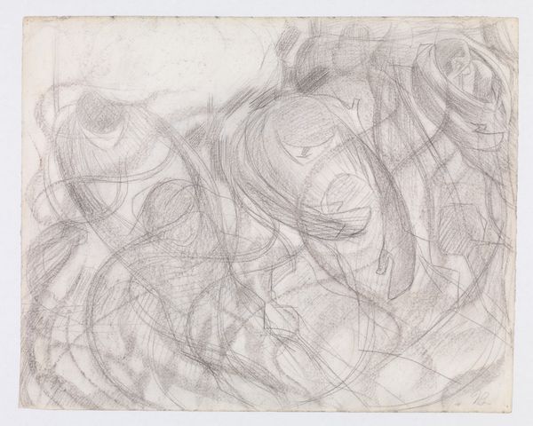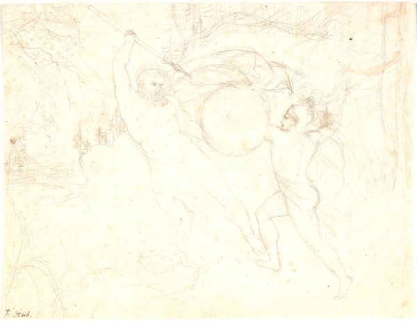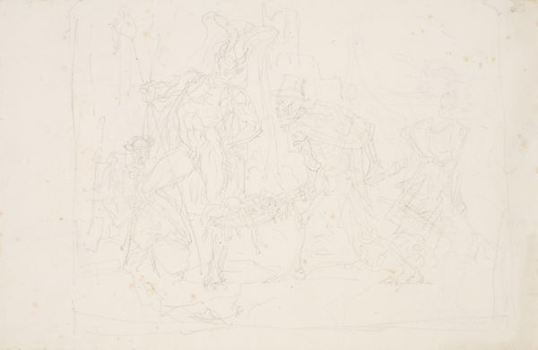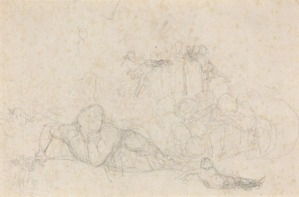 Curator: Looking at this preparatory drawing, it strikes me as a whisper of a much grander artistic idea, almost ghostly. Editor: Indeed. What you're observing is Victor Müller's study for "Adoration of the Shepherds," a work he developed around 1851-1853, now held at the Städel Museum. We see his hand at work with pencil and chalk on paper, a delicate yet determined effort. Curator: Determined is a great way to put it. The sketchiness, the fleeting lines, they feel like Müller's trying to pin down a dream before it fades away completely. Editor: Precisely. The choice of history painting situates Müller within a broader artistic context. We see how the legacy and expectations of historical depiction impact this more intimate exploration. The shepherd's adoration is almost lost in the fog. Curator: I can't help but feel the almost frantic energy in these lines. It's interesting how the religious theme plays within this sketch too—it’s quite Romantic in its intensity. Were the politics of religious imagery particularly charged then? Editor: Absolutely. Mid-19th-century Europe witnessed significant religious and social upheaval. Müller's romanticism isn't just aesthetic; it is reflective of a deep yearning, even questioning, around traditional religious narratives and institutions, which impacted artists profoundly. Curator: It makes you wonder about the shepherd to the right, almost separate in a private moment, like they might know a secret. The overall sketch feels incomplete and maybe more revealing, precisely for it. Editor: It’s true, and in many ways, this rough, unfiltered expression might reveal more than any polished, completed painting ever could. Curator: A fascinating insight. It speaks to the inherent power of early sketches, doesn't it? That initial spark, captured raw and honest. Editor: I agree completely. Perhaps it is like peering directly into Müller’s artistic consciousness.