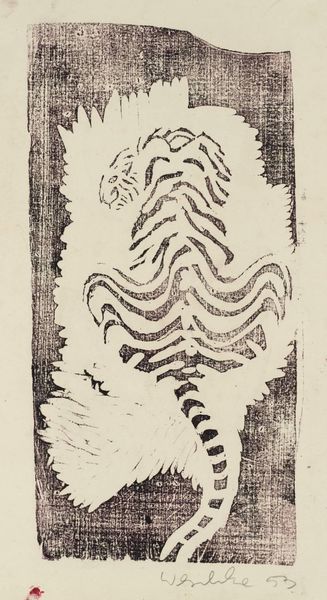 Editor: Here we have "Rabbits Under Moon" by Utagawa Hiroshige, an ink and print drawing, part of the Ukiyo-e movement. It's incredibly subtle. I’m immediately struck by the stillness, despite it featuring animals. The soft wash of the moon makes the rabbits seem almost ghostly. What feelings or ideas does this piece evoke for you? Curator: Ghostly, yes! It reminds me of stories told in hushed voices under the moonlight, tales of folklore where animals possess otherworldly wisdom. See how Hiroshige uses a minimalist approach? The rabbits, though central, are almost swallowed by the negative space. This pushes them to the forefront and suggests not just rabbits under the moon, but rabbits *of* the moon, connected to lunar cycles and ancient beliefs. Editor: So, they are symbols? I just saw them as, well, rabbits. Curator: Everything is a symbol, or *can* be! Especially in Ukiyo-e, the artist isn’t merely representing something; they are imbuing it with cultural and emotional significance. Think of the moon itself – what does it represent? Cycles, mysteries, feminine energy. Hiroshige isn't just drawing what he sees but suggesting what he feels, inviting us into that meditative space with him. Have you noticed how our eye moves upward with their gaze to the moon above? It creates the visual effect of floating, drawing us into the landscape. Editor: It’s easy to miss that detail. I was focused on the rabbits. Knowing that really transforms the artwork. Now the negative space seems less empty, more intentional and encompassing. It’s interesting that Hiroshige can evoke such emotion and convey so much symbolic information using only minimal details and few color washes. Curator: Yes, it's truly poetic and very typical of Ukiyo-e art. And perhaps now you'll be careful to consider these stories when walking under the next full moon. I know I will!