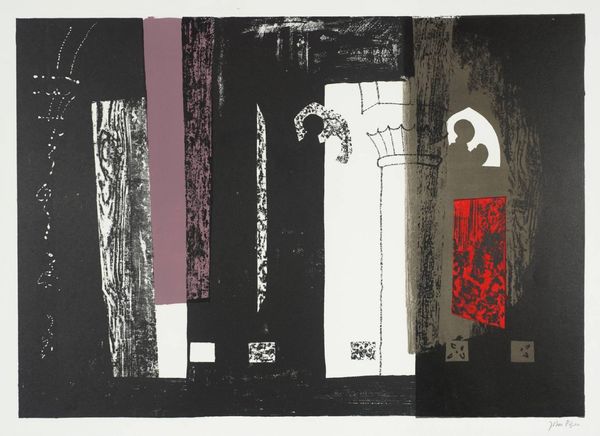 Editor: This is John Piper’s "Three Somerset Towers," held at the Tate. It’s a print of three church towers, side by side. I’m struck by the contrast between the dark backgrounds and the almost glowing, intricate details of the towers themselves. What do you see in the way Piper constructed this image? Curator: Consider how the artist exploits the tension between representation and abstraction. Notice the impasto-like texture achieved through the printing process itself, creating a palpable sense of surface. The color palette is strategic; how does the juxtaposition of dark tones and light highlights affect your perception? Editor: It gives a sense of drama, almost gothic, but the abstraction keeps it from being overly sentimental. I see how the texture adds to the overall feel. Curator: Precisely. The towers become less about architectural accuracy and more about a visual and tactile experience. The medium itself becomes part of the message. Editor: That's fascinating. I hadn't considered how the printmaking technique contributes to the artwork’s overall impact. Curator: Reflect on how the visual elements – color, texture, and composition – converge to create a uniquely aesthetic experience.