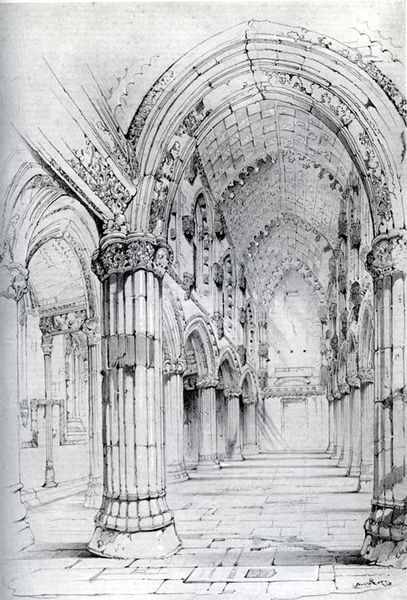 Curator: Right, let’s dive into this striking sketch! It’s titled "Study for Westminster Abbey, from Microcosm of London" by Augustus Charles Pugin, dating back to around 1809. It’s a print—an etching with pen and ink on paper, held here at The Art Institute of Chicago. Editor: Immediately, it has a very spectral and hollow feel. It’s more a diagram than an image intended to evoke the sublime grandeur of a place such as this. You can almost feel Pugin constructing the drawing on the page. Curator: Yes, that’s beautifully put. This work showcases the North Isle of Westminster Abbey, but more than that, it illuminates the artist's methodology. You can almost feel him teasing out the architecture’s soul. His mastery with the etching technique creates an almost palpable atmosphere. Editor: The rapidograph quality of the line underscores it being, essentially, architectural draftsmanship. The quick gestures used for shadow give it a spontaneous feel that humanizes the massive scale. It makes me consider the economics of reproducing images at the time and how prints were becoming a viable method for dissemination to a burgeoning middle class hungry for depictions of aristocratic spaces. Curator: Exactly. What might surprise viewers today is to know this sketch belongs to a series entitled, *Microcosm of London* aimed at mass audiences to reveal not just architecture, but vignettes of contemporary London life happening inside these major civic structures. Think about that… Editor: Right—labor and capital creating even spaces like this! What does seem to remain ambiguous, however, is where Pugin may be situated physically, as there seems to be no place for him on the same plane in the Abbey, and the location implied would seem impossible to achieve! Curator: And perhaps it *is* about achieving the impossible, through lines, through structure, through dedicated rendering! It makes you think how much time the artist would need to dedicate to making sure the perspective is as accurate as can be to the real scene that is depicted here. Editor: Yes, indeed—it’s really a testament to that transitional point where meticulous craft meets emerging industrial processes for wider distribution of information and visual data. Curator: I love how we have traced from artistic intentions and emotive responses into considering this piece as a crucial artifact of its time. Editor: Absolutely, an etching layered in social and material histories—quite marvelous.