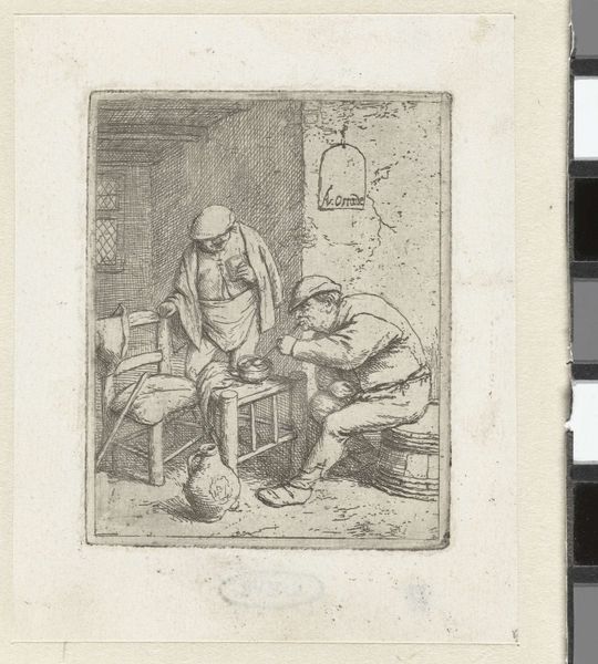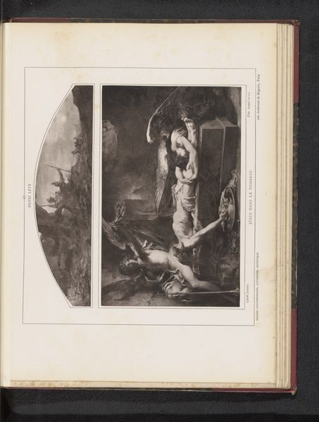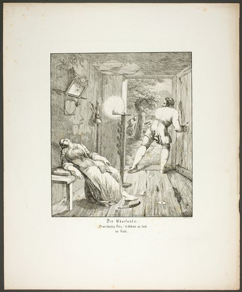 This etching, "Chained Man in Cell," was created by John B. Skippe. The composition immediately draws us in, with its stark contrast between light and shadow. The figure, rendered in somber tones, is sprawled diagonally across the picture plane. This form leads our eye from the shadowy corner, where heavy chains hang uselessly, towards the pale, illuminated face of the prisoner. The structural elements within this artwork engage with notions of confinement. The cell, defined by rigid bars and stone, imprisons not just the body, but also the spirit. The artist uses line and form to create a sense of claustrophobia and psychological depth, mirroring the intellectual climate during its creation. The use of a monochromatic palette serves to emphasize the lack of vitality and hope, intensifying the emotional impact. The visual structure works as a semiotic system, where the chains, shadows, and enclosed space symbolize entrapment and the complex interplay between power and the individual. This artwork invites ongoing interpretation as we consider the philosophical implications of constraint and freedom.