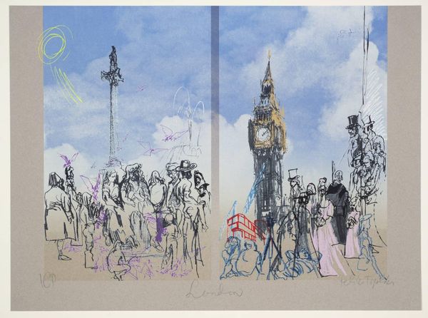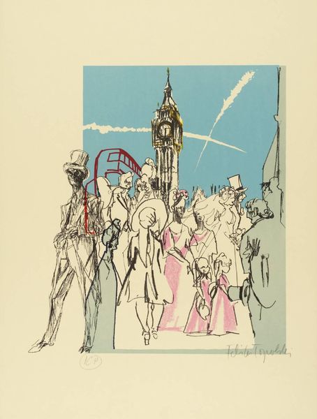 Curator: Feliks Topolski’s "City" captures a moment, but also a societal structure. The suited figure with the umbrella, juxtaposed against the frenetic energy of the city, speaks volumes. Editor: It definitely feels like a commentary. What do you see in this piece in terms of historical context? Curator: Well, Topolski, as a Polish émigré in London, offers a unique perspective. I wonder if this work reflects the tensions between individual agency and the overwhelming forces of urbanization and capitalism? Think about class, immigration, and the lived experience of modernity. Editor: That's really insightful. I hadn't considered the immigrant perspective. Curator: It adds another layer, doesn't it? Art as a mirror reflecting society's complexities. Editor: Absolutely. I'll definitely look at Topolski's work differently now. Thanks! Curator: My pleasure!