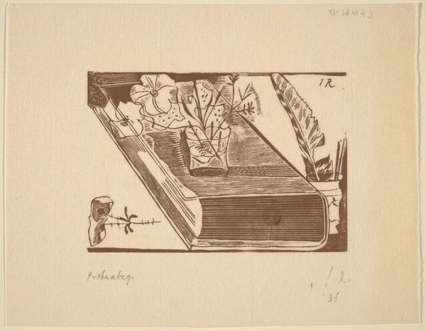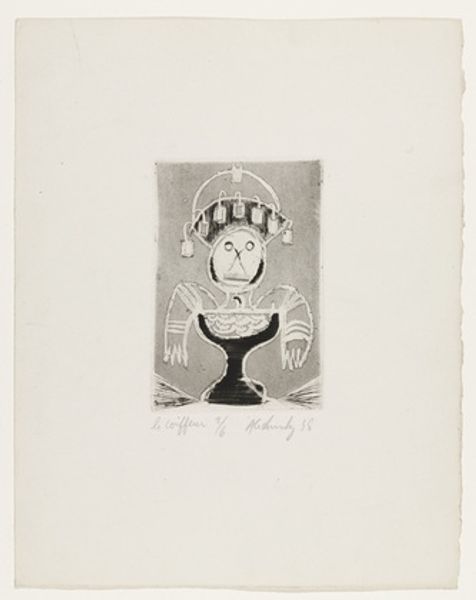 Curator: My first impression of this piece is the stark contrast! It's quite moody despite the simple subject matter. Editor: We are looking at "Le petit pot de fleurs," or "Small Pot of Flowers," a 1947 print by Pablo Picasso. It is rendered in ink, using strong lines and shading. The fact that this is a print immediately brings the production aspect into focus. What can we tell from that about its accessibility in Picasso's time? Curator: Potentially mass-produced, and intended for wider distribution, so perhaps speaking to the middle class, a reflection on post-war austerity even, depicted by the inexpensive material. Editor: It’s striking how, even in this modest medium, Picasso's style comes through so clearly. You can trace his explorations with Cubism, particularly in the fragmented presentation of the pot and flowers. He takes an everyday item and fractures its form. It’s an interesting example of how artists leverage institutions like printmaking to reach broad audiences with challenging visual ideas. How do you see that fracturing, specifically as it relates to the materiality of the piece? Curator: Look at the rough quality of the lines and the visible texture created by the ink, almost like the materials themselves are rejecting classical, smooth representation. It disrupts traditional expectations around the print as a polished product. I'm drawn to the physical act of applying the ink, suggesting labor, challenging any separation of ‘high’ art from craft. Editor: And I wonder how audiences reacted to seeing such deconstructed forms reproduced for mass consumption? This could’ve been quite challenging to typical art viewers expecting refined, classically beautiful imagery. What social commentary might that be reflecting? Curator: Maybe questioning what is considered precious. I keep thinking about consumption; buying this would allow engagement with revolutionary art at a lower economic threshold than painting, suggesting democratized value. The very making of this art opens an invitation for critique. Editor: Agreed. I find myself looking past just the image itself toward the larger implications of what Picasso chose to create and reproduce with this artwork. Thanks to Picasso’s legacy this piece can serve as an indicator of how imagery moves within social spheres. Curator: It highlights the tensions between art and the everyday and really urges us to examine value, making the means as worthy of study as the subject matter.