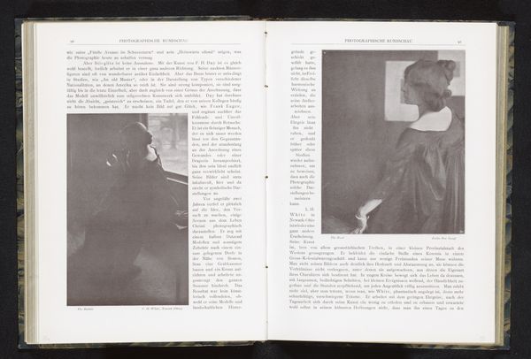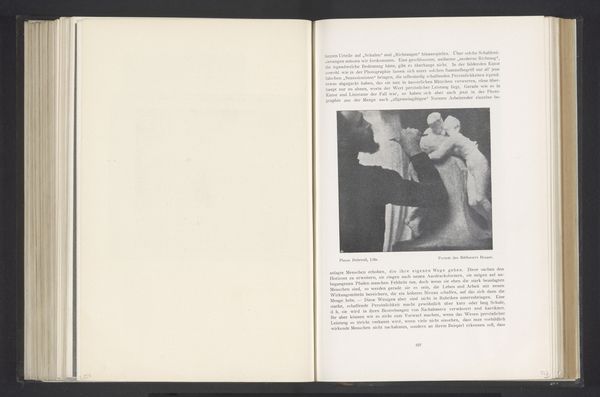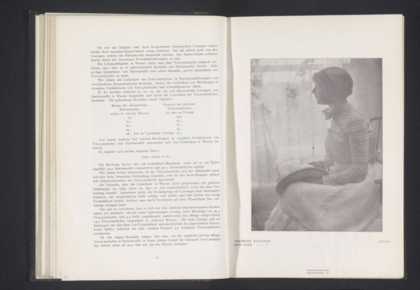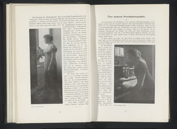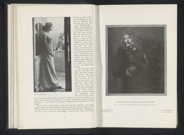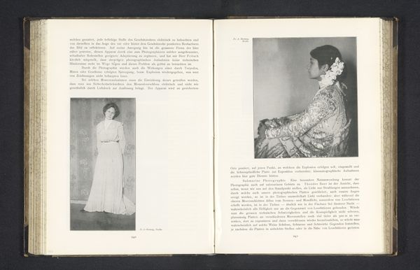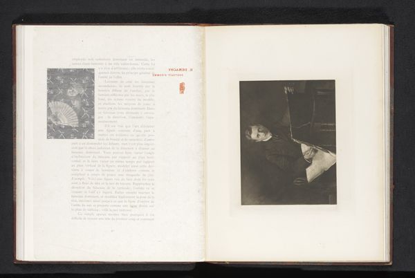 Editor: We’re looking at a photographic print, a gelatin-silver print titled *Portret van een onbekende vrouw*, or *Portrait of an Unknown Woman*, created before 1903 by Alfred Kirstein. It’s reproduced in a book spread. It strikes me as being remarkably intimate, almost like a secret snapshot, wouldn't you say? What do you see in this piece? Curator: A ghost from the past, whispering forgotten stories! The unknown woman, framed within a book, becomes doubly mysterious. Is she a phantom, trapped in ink and silver? Or are we, the viewers, intruding on a private moment, accidentally glimpsing a life that was? And is there some subtle Intimist reference, tucked away in a book? The use of the gelatin-silver print is amazing to convey emotion, wouldn’t you agree? Editor: I do. I hadn't quite picked up on the 'ghost' idea initially, but that reading certainly resonates. The image quality isn't what we'd expect today - perhaps that has something to do with it? Curator: Precisely! The imperfections, the delicate fading... It's a gentle reminder of photography’s fragility and also our own. Do you find it melancholic? Or something else altogether? Editor: There is definitely an emotionality, especially that ghostly touch. I would have easily walked by without even seeing her! Curator: Isn’t that always the risk, when looking at art? Missing what is right in front of us. Still, it’s there for us, waiting.