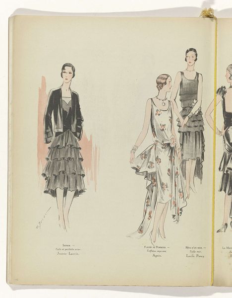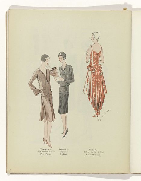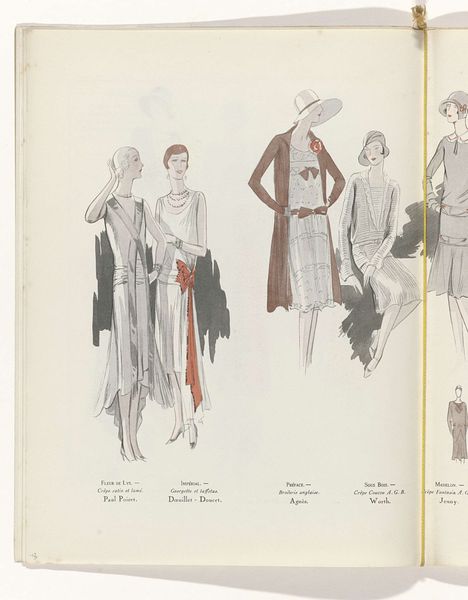 This fashion plate, 'Art - Goût - Beauté,' was made by J. Dory in June 1929. It's delicate; you can see the artist's hand, how they carefully built up the images with light touches of colour. There's a beauty in the imperfections here; the lines aren't perfectly crisp, and the colours blend softly. It’s very different from a photograph. The texture of the paper shows through, reminding us of the physical act of creation. Notice the subtle shading and the way the colours interact – soft greys, muted reds, and gentle pinks. The artist uses these to create depth. I love the small details like the way the folds of the clothing are suggested with just a few strokes. It has an echo of artists like Christian Bérard, who worked in a similar style around the same time. Fashion plates like this weren't just about showing off clothes; they were about creating a mood, a feeling, and the sense of a modern woman of the time.