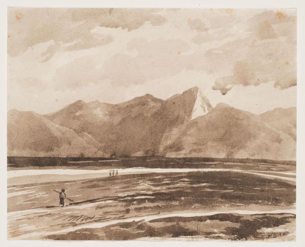 Curator: Let’s turn our attention now to "Swiss Landscape with a Village in the Distance," a watercolor and ink drawing, likely rendered *en plein air* by Sarah Grace Lushington. Editor: My first thought is how ephemeral it feels. The washes of watercolor are so delicate, like a fading memory of a place. It's like the landscape itself is sighing. Curator: I agree! Lushington captures that Romantic fascination with nature’s grandeur while also hinting at its transience. I see it as less a straightforward depiction, and more a sensory experience. Think of the actual labor involved to arrive here with equipment and tools. Editor: Good point, one needs to consider the social context, yes? How the means of production contribute to an artwork like this one, as it might shape it—even considering class... But the choice of materials adds to the quiet, reflective mood, doesn’t it? We've got the very tactile quality of the paper playing against the misty forms... I see an active choice about material and medium at work here, even more than the social forces that permit its creation. Curator: Indeed! And observe the contrast, the crispness of the drawn lines versus the blurred watercolor. To me it evokes a dialogue between precision and freedom, much like a landscape painter grappling with representing the natural world—trying to honor its immensity in the small gestures they're allowed. I’m imagining her working outside, fighting against the wind or sun, or some persistent insect perhaps! The realities of physical presence can really color the results! Editor: The human presence is also intriguing—look at the miniature figures barely sketched along the path. Are they even human, or more like sticks to gauge our perception of scale and our relation to the immensity before us? Curator: Good question. It adds to that feeling of romantic isolation, don't you think? Each stroke almost a whisper! Well, looking at "Swiss Landscape," it is striking how materials and their execution work in harmony to capture the essence of Romantic landscape traditions! Editor: Agreed, its evocative power transcends mere representation; it’s a tangible expression of human connection with a sublime setting and our artistic labor to create it.