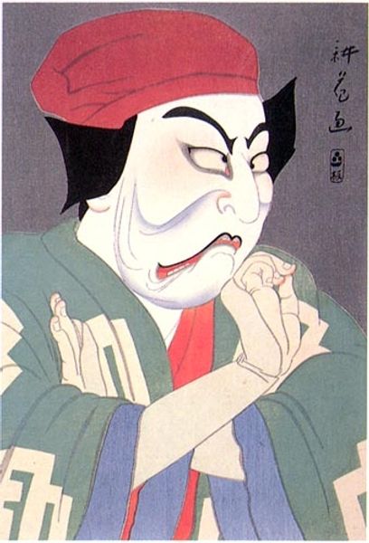 Editor: This woodblock print, created in 1954 by Natori Shunsen, portrays Ichikawa Sadanji as Yoshiro in the Dance Modori-Kago. The face, with its strong lines and Kabuki makeup, strikes me as quite intense. What can you tell me about the significance of the imagery? Curator: It's interesting you pick up on the intensity. The Kabuki aesthetic is deeply rooted in symbolism. Look at the stark white face – oshiroi – and the bold red around the eyes. In Kabuki, white masks the human, allowing the actor to embody a role completely, almost as a vessel. Editor: So, the white face isn’t just make-up; it's more like a ritual mask? And what about the red around the eyes? Curator: Precisely! Oshiroi creates a blank canvas for transformation. The red around the eyes suggests heightened emotion. Think about what red often symbolizes across cultures – passion, anger, danger. Here, it points towards a character grappling with intense inner conflict, amplified by the blue costume. The symbolism resonates beyond mere visual appeal. Does it shift how you perceive his expression now? Editor: It does. It’s not just a stern look. There's a struggle, almost a tragic depth to it. So, reading these visual symbols allows us to understand not just what we see, but what the artist, and even the actor through the role, are trying to convey about humanity. Curator: Exactly! The Ukiyo-e tradition serves as a memory of culture – capturing these transient moments of performance and revealing enduring archetypes of emotion and conflict within them. Understanding the visual vocabulary unlocks a richer narrative. Editor: This makes me appreciate how much history and storytelling can be packed into a single image! Curator: And how consistent symbolic language can be across generations through visual art.