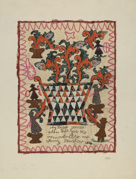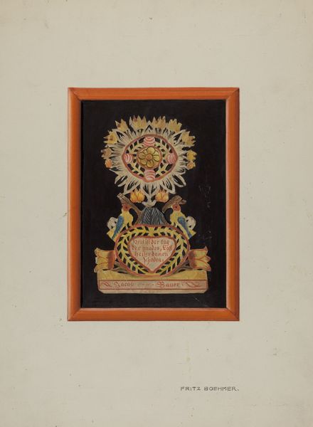 Clyde L. Cheney made this framed paper cutting, memorializing Thomas Jarvis, sometime between 1873 and 1995. It combines the fragility of paper with the precision of sharp tools. The act of cutting transforms a common material into an intricate design. Consider the labor involved. Each cut was carefully planned and executed, demanding focused attention. Cheney likely employed techniques handed down through generations, underscoring craft's transmission through social networks. Note how the dark paper contrasts with the lighter background, creating depth and shadow. The design itself is full of conventional images signifying mourning: doves, a wreath, and a stylized palm tree. The work invites reflection on mortality and remembrance, as well as questions about the values we ascribe to different kinds of skill. Cheney's choice of paper elevates the medium, demonstrating that profound meaning can emerge from everyday materials. It challenges distinctions between craft and fine art, reminding us of the cultural significance embedded in the making process.