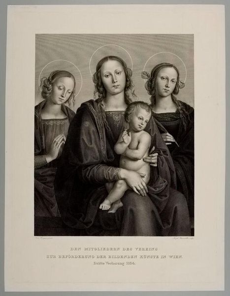 Editor: This is "Madonna and Child with Two Saints" by Joseph Steinmüller. The printmaking creates a subdued mood. How do you interpret this work through its material existence? Curator: Note the mechanics of its reproduction – this wasn't meant as a singular, precious object. It circulated, perhaps widely. Consider who owned this, why, and the social function it served beyond simple devotion. Editor: So, the value isn't necessarily in the image itself, but in its accessibility? Curator: Precisely! Think about the labor involved in producing multiple copies. What does that tell us about the art world and its relationship to commerce at the time? Editor: That shifts my perspective entirely. I hadn't considered the implications of its reproducibility. Curator: Reflecting on material conditions deepens our comprehension.