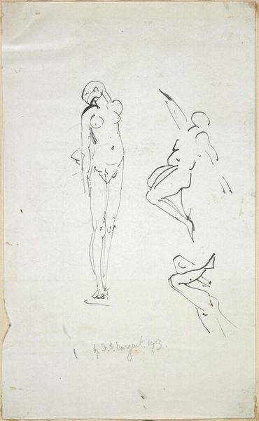 Editor: So, we're looking at "Studies of Anatomy, Measurements and Writing" a pen drawing on paper. It looks like it’s from the Modernism movement by James Ward. It’s really intriguing how he's mapped out these human figures, almost like architectural blueprints. What do you see in this piece, beyond just anatomical studies? Curator: It is fascinating, isn't it? To me, it speaks volumes about the societal obsession with codifying and controlling the human form. Look at the measurements, the almost scientific breakdown of the body into "heads." Who gets to decide these proportions? How do these ideals impact marginalized bodies that inevitably fall outside of those restrictive parameters? And consider how the artist employs writing – it reinforces the supposed authority and "objectivity" of the anatomical study, while perhaps subtly hinting at the arbitrary nature of these proportions. Editor: That's a perspective I hadn't considered. It’s like the drawing isn't just about understanding anatomy, but also about power dynamics? Curator: Precisely. Consider how often art has been used to enforce social norms around beauty and the body. This piece might be an attempt to engage with those historical and contemporary power structures. How do these constructed proportions and aesthetic values impact individuals' sense of identity and belonging? Think about feminist theory and its critique of the male gaze or critical race theory that analyses the marginalisation and pathologisation of non-white bodies. Editor: It's making me rethink the intent behind such "objective" studies. I was focusing on the artistry, the linework. I now see it goes much further. Curator: Art never exists in a vacuum. The lines themselves are imbued with the history of those that drew them, as well as what/who the artist omitted. Editor: This has definitely opened my eyes to how much context shapes our interpretation. Thanks! Curator: And thank you for your insight and engagement. Thinking about art in this way helps us unpack complex power dynamics and encourages crucial conversations around identity, representation, and the social impact of visual culture.