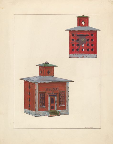 Chris Makrenos made this work showing a ‘Toy Bank’ out of graphite and colored pencil, at an unknown date. At first glance, it depicts a child's novelty item, but it’s also a window into the socio-economic values of its time. The image of a toy bank, styled like a miniature building, reflects the cultural emphasis on saving and financial institutions. Notice the words "Novelty Bank" emblazoned above the door. What did ‘Novelty’ mean in the past? Produced in the United States, at a time when industrialization was changing the shape of society, the work encourages personal responsibility and thriftiness. It’s a simple message that speaks volumes about the era's values and how they were instilled from an early age. To fully understand this image, one might consult historical records of toy manufacturing, advertising, and economic trends. The meaning of art is contingent on understanding its social and institutional context.