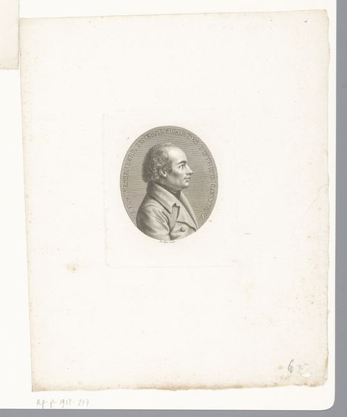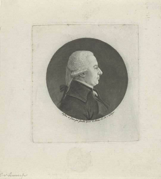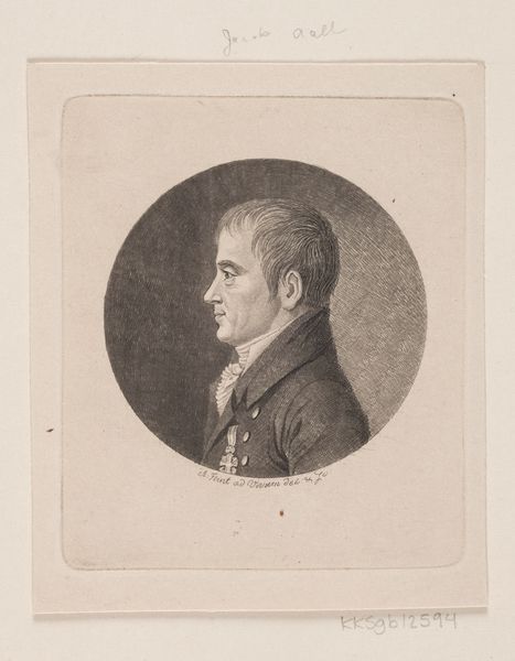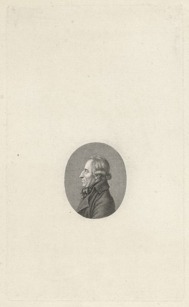Editor: Here we have Johann Friedrich Bolt's "Portret van Georg Wilhelm Pfingsten" from 1803, an engraving on paper held at the Rijksmuseum. I am immediately struck by its formal, almost severe, tone. What stands out to you as you consider this piece? Curator: What resonates with me is how Bolt, even within the constraints of academic portraiture, subtly conveys the sitter's perceived character through codified visual cues. Notice the subject's profile: the firm set of his jaw, the pursed lips. How might these features be "read" by viewers of the time? Editor: As determination, maybe? Or stubbornness? Curator: Precisely! It's fascinating how such seemingly minor details accumulate meaning. Think about the choice of presenting him in profile. What connotations does that evoke compared to a full-face portrait? Editor: Maybe it gives a sense of distance or objectivity, removing some intimacy? Curator: Possibly, but also strength. Medals are struck in profile to ennoble the leaders whose heads they carry. His plain dress only serves to ground him with the working populace. What memories are evoked by this image? Editor: I hadn't considered how a profile view could suggest strength like that. The simple coat, to me, emphasizes Pfingsten's apparent commitment to serious matters, someone uninterested in frivolous displays. Curator: A powerful interpretation. Bolt uses this combination of realism and classical elements to subtly position Pfingsten within a specific social and intellectual landscape. The weight and direction of cultural symbolism! A question; does the print's existence give added historical value to his status and character? Editor: Absolutely, thinking about the effort it took to produce and the intention behind immortalizing him this way definitely elevates his significance. Curator: Indeed. So, by examining these elements, we gain insights into both the individual depicted and the broader cultural values of the time. It shows us that even in simple realism, much can be extracted.