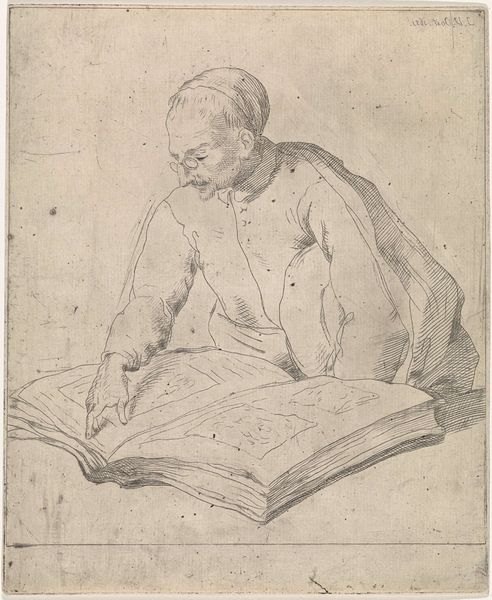 Editor: So, here we have Gerard van Honthorst's "Old Woman Singing," created around 1625 using pen and ink. The immediate thing that strikes me is the intense, almost comical, realism in the portrayal of this woman. What do you see in this piece, beyond the surface level? Curator: Ah, yes. She’s belting one out, isn't she? More than a realistic study, it’s like a captured moment of pure, unadulterated expression. Think about the time: early 17th century. Honthorst, who's flirting with the Baroque, often explored scenes of everyday life, infused with drama. It’s the raw emotion –the vulnerability on display—that hooks me. Almost theatrical, wouldn’t you say? A tiny stage for a humble diva. Do you feel a sense of the ephemeral about her, as if the song is already fading the moment she sings it? Editor: Definitely. The fleeting moment captured, I see that now. I also find it striking how the drawing uses such strong lines. Is that characteristic of the Baroque style? Curator: It’s interesting you pick up on that, because while Honthorst’s known for bold chiaroscuro in his paintings, here, with the ink and pen, he seems to relish in line. But observe how he uses those very lines—the cross-hatching around her eyes, the scraggly detailing of the hands holding the page. What’s he telling us? Maybe aging isn’t elegant. Or that beauty exists even—especially—in the unconventional? It is almost as though her humanity becomes even more intense when rendered this way. It is honest in a way that's deeply affecting. Editor: That is true, I didn’t notice it before! Thinking about the way the artwork is trying to portray an emotional moment as you were saying...Thank you so much for your time and such deep insight. I see and appreciate so many new things now. Curator: It was my sincere pleasure. Art's most fabulous trait is how it alters each time you view it and shifts you at the same time.