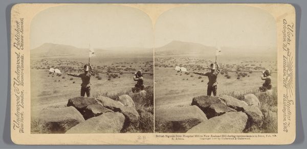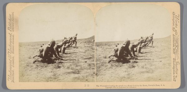 Editor: This gelatin silver print, titled "Geënsceneerde voorstelling van Britse soldaten op een heuvel in Zuid-Afrika," by Underwood & Underwood, was made in 1901. There's something stark and unsettling about this seemingly quiet depiction of soldiers. What do you see in this piece? Curator: I see layers of historical memory embedded in the sepia tones of this image. Note the figures hugging the earth, a literal embodiment of colonial entrenchment. But consider the weapon—the rifle extends them, almost merging them with the rocky ground, extending the empire. Do you think that merge intentional, a suggestion of both conquest and ownership? Editor: It could be, it definitely adds to the sense of a kind of forceful belonging. Like, these soldiers *are* this landscape now. Curator: Precisely. It raises difficult questions about visibility and erasure. The soldiers, rendered in such a way as to seem at one with the environment, simultaneously blend in and claim ownership of the land. What enduring narrative does that reinforce, visually speaking? Editor: A narrative of dominance, perhaps. That the colonizer is naturally, inextricably linked to the colonized land. Curator: The symbol of that "natural" bond carries enormous weight, even now. Underwood & Underwood mass-produced these images, almost like souvenirs, propagating a particular view of the world for the folks back home. Editor: So it's not just a photograph, but a carefully constructed symbol with its own intended audience and message? Curator: Exactly. It's a complex artifact that performs more than it portrays. I look at that soft sepia tone and it hits a cultural nerve that speaks volumes. Editor: That's really interesting, I hadn’t thought of it like that, seeing how this photo isn't just showing something, but it *doing* something.