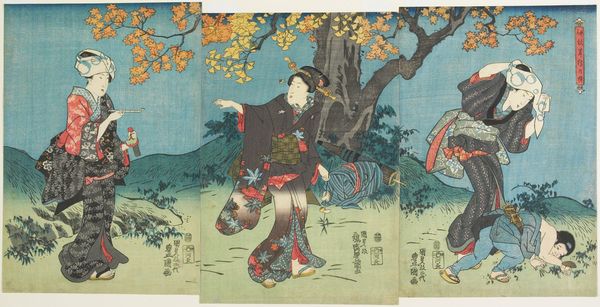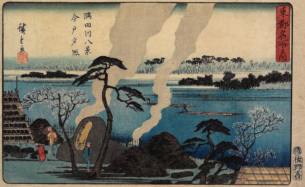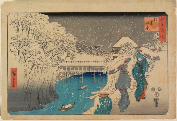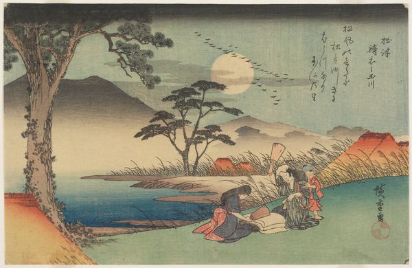 Curator: This woodblock print, “Woman and Badger,” from around the 19th century by Utagawa Hiroshige, immediately strikes me with its intriguing composition. What is your initial take on this piece? Editor: A bit eerie, if I'm honest. The figure hunched amidst those reeds definitely disrupts any expectation of typical serene landscapes often seen in ukiyo-e. There's a sense of concealed labor, something furtive and potentially transgressive taking place. Curator: Indeed, there's a fascinating dialogue established between the human and the animal. The woman, bearing a sizable basket, perhaps laden with her trade or foraged goods, juxtaposes strangely with the badger who seems almost caught in its own domestic enterprise within the tall grasses. Note how the black inks emphasize contour, directing your vision through an intriguing spatial recession, while grounding the depicted activities within tangible form. Editor: And the production itself, let's remember this is a print, it reveals much about the labour involved. This isn't a spontaneous painterly gesture but a constructed image borne from collaboration; artisan carvers meticulously translating Hiroshige's designs, inkers ensuring uniform applications onto paper. And then the paper itself: its quality, its source... This work speaks volumes about the entire economy of printmaking at the time. What was the circulation? Who were its intended consumers? Curator: Good points. Beyond the social aspects you raised, from a formal stance, there's deliberate asymmetry in the placement of the figures and compositional elements; the dark bush on the left, balancing against the grasses on the right. I interpret this as mirroring a kind of tension between the everyday reality the woman is moving through versus something primal hinted at by the badger. Editor: That tension resonates in how their labors converge: the woman bearing and transporting, the badger seemingly fishing or preparing its catch. It makes me consider subsistence strategies, human entanglement with animal lifecycles, perhaps reflecting concerns about food security and rural existence that would have been familiar anxieties during its creation. How do labor, materials and environment come into conversation? Curator: The print’s formal aspects invite layers of interpretation that enrich the image beyond merely documenting a simple rural scene, offering contemplation on society, humanity and their relation to the natural world. Editor: Absolutely. Attending to materials, means of production allows us to consider how ukiyo-e was enmeshed within the broader social fabric and its relationship with class, labor, and its natural context. It is, itself, a manufactured artefact intimately tied to tangible experience.