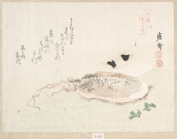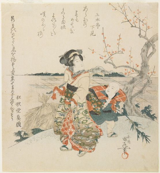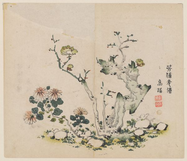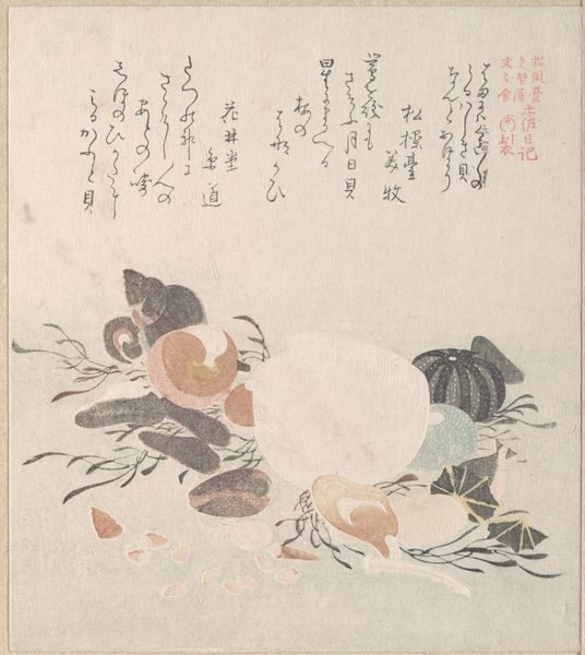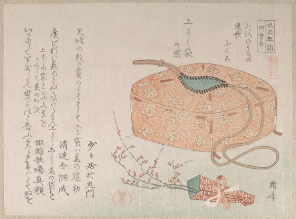 Editor: This woodblock print by Hokusai, titled "Folded Kabuki Costume," was created to celebrate the 100th anniversary of an actor's death. It depicts a folded costume beneath a plum tree. What strikes me is how the print memorializes a performer through the imagery of his costume rather than a portrait. How do you interpret that choice? Curator: It speaks volumes about the social standing and the public role of Kabuki actors in 19th-century Japan. The costume becomes a metonym for the actor himself, a powerful symbol recognized by the audience. The print highlights how celebrity was constructed and consumed through material culture. Editor: That's fascinating! It shows how objects can embody cultural significance. Curator: Precisely. And the plum blossoms, symbols of resilience and renewal, enhance the commemorative aspect. It all points to the enduring legacy of the actor, shaped and amplified by the print's circulation within society.